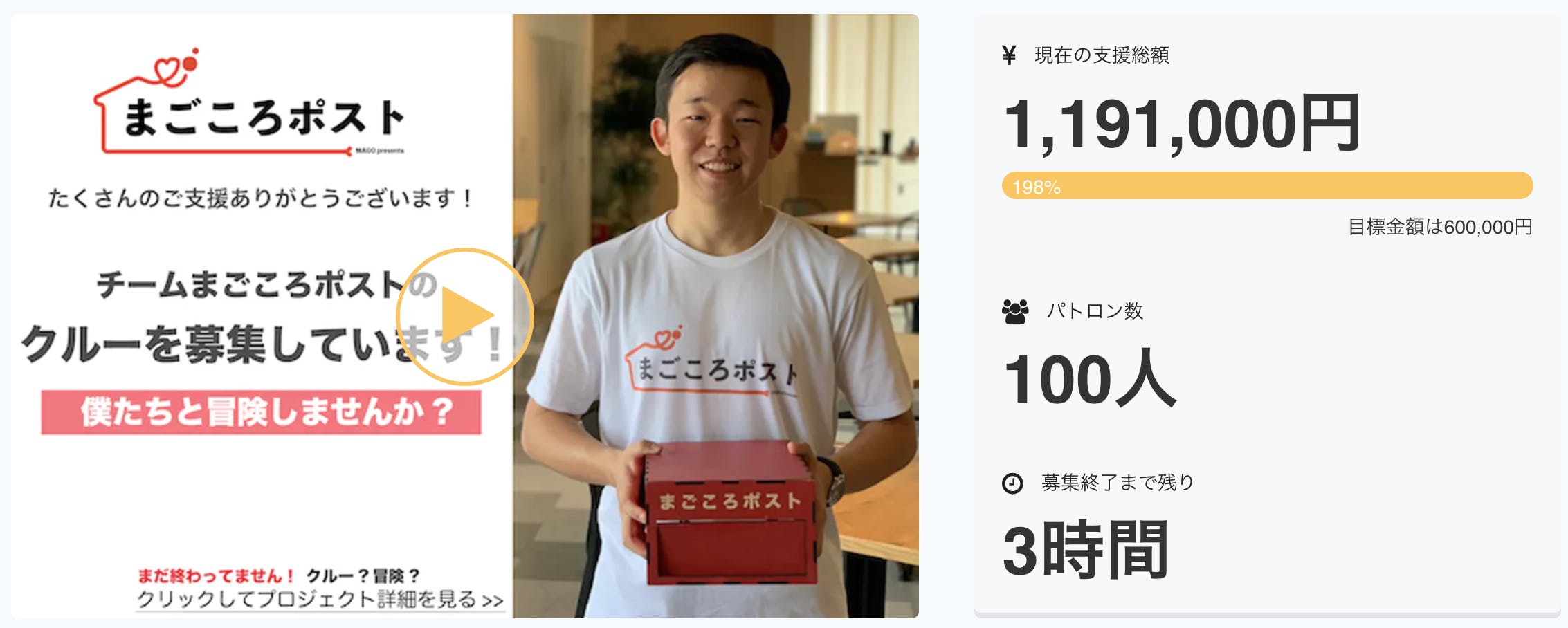 2019/01/12 21:18クラウドファンディング終了まで、残り3時間となりました!このクラウドファンディング終了後、応援してくださったクルーの皆さんへ、“クルー限定” チームまごころポストのFacebookグループへの招待メッセージをお送りさせていただきます。そちらでは、今後のまごころポストの進捗のご報告や緊急のユーザーテストへの協力のお願い、私たちからクルーのみなさんへの質問箱の設置など!を行っていきます!まごころポストの様子も、すこしですがお見せしていけると思います!(^O^)まだ未完成・未発表のまごころポストについて、クルーのみなさんへご報告、相談、ご意見募集の場として主に活用していくFacebookグループですので、限定公開とさせていただきます。m(.. )mまた、現在ご報告に使用しているこちらのページも引き続き投稿してまいりますが、クルー限定とは内容が異なって参ります、、そのため!多くのクルーと現段階で繋がりたいと思っておりますので、ぜひクラウドファンディング終了までよろしくお願いいたします!!!https://camp-fire.jp/projects/view/113026まごころポストの完成は、僕たちメンバーの知恵や力だけでは達成できないかもしれません。素晴らしいまごころポストを多くの家族に届けるために、僕たちと一緒にクルーとして冒険してくれませんか?よろしくお願いいたします! もっと見る