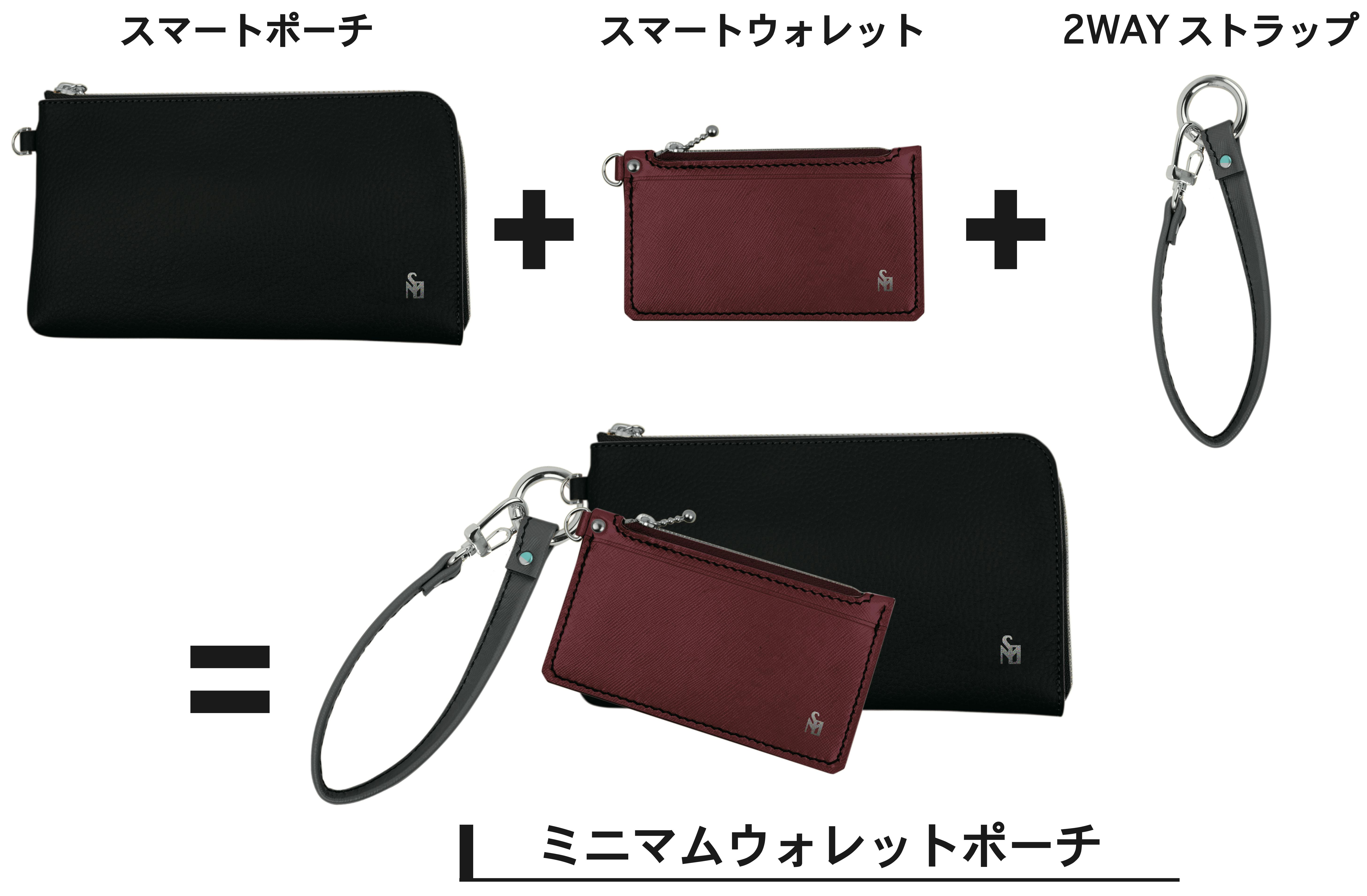 用途に合わせて最小限をカスタマイズ。スマートポーチにはスマートフォンを中心とした小物系をスマートウォレットにはお金やカードを分別収納して、スマートに出し入れ。