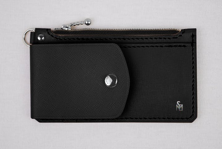 コイン、カードの収納を中心とした、スマートでスリムなお財布。Dカン付で、ストラップ、ポーチとつながり、カスタマイズ。ホック式のフラップタイプで、アウター使いでもカードを落とす心配がありません。インナー使いでは、鍵やチャームなども取付けることができます。