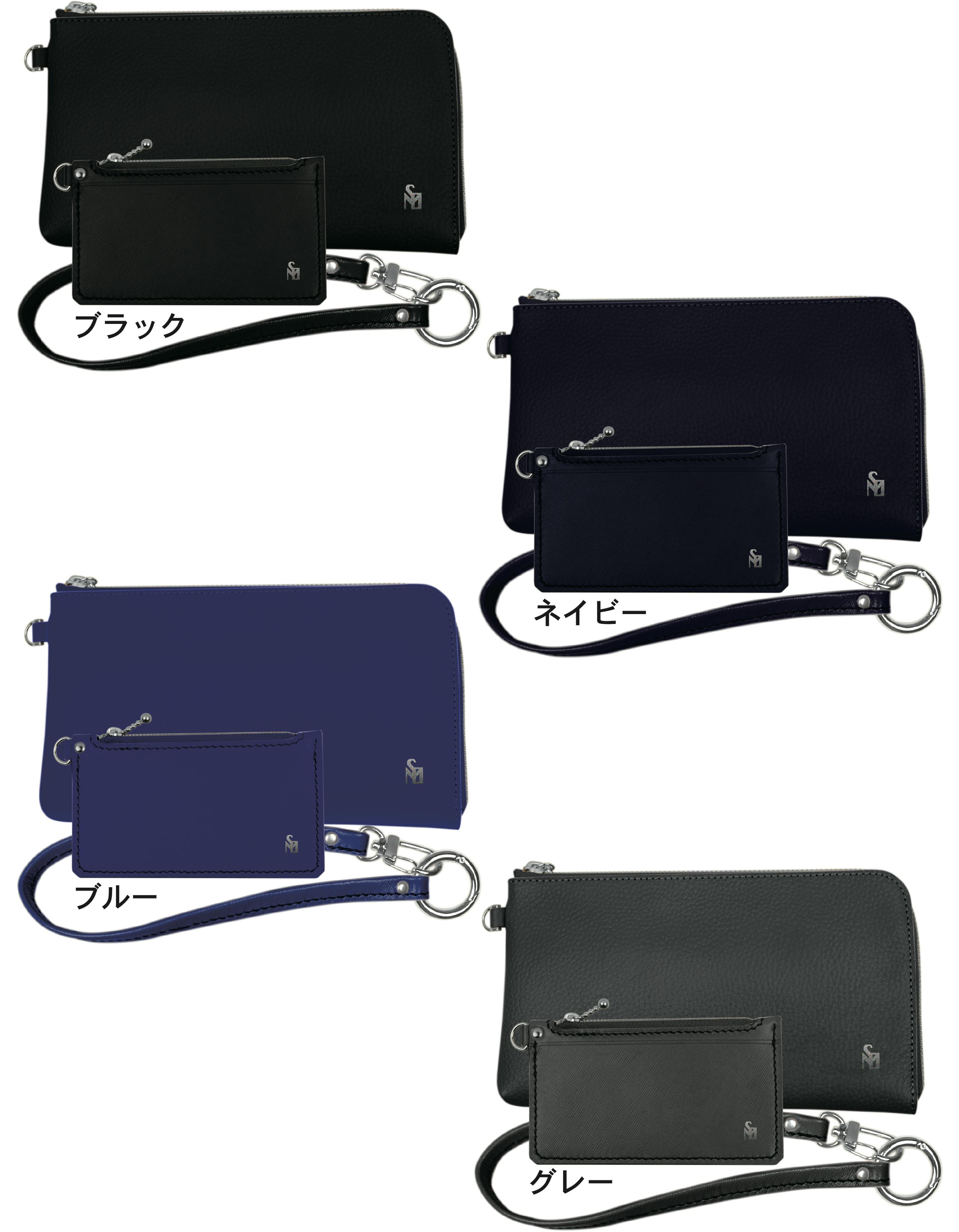 ①スマートポーチ・・・Lファスナータイプで出し入れがしやすい。サイズは小さすぎずスマートフォンを手帳型のケースに入れても余裕があり、パスポートはもちろん、通帳やご祝儀袋、香典袋等長手のサイズも収納できます。