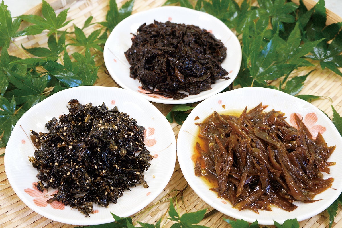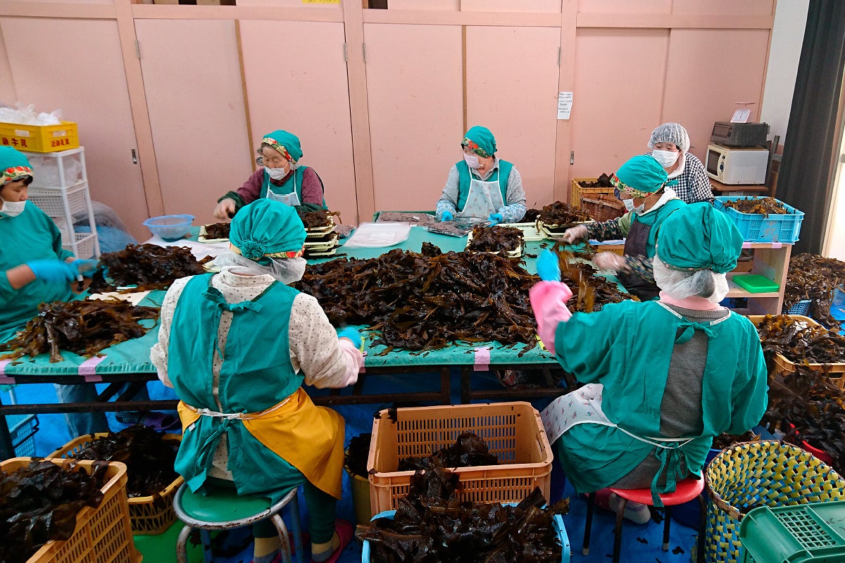 これまでに同グループでは、1番美味しい時期に獲った天然ワカメを冷凍保存をした「天然冷凍生わかめ」やワカメを使った地場ならではの加工品を開発・製造してきました。天然ワカメを甘辛く炒り上げた「わかめっ娘」や、栄養たっぷりの茎部分を炊き上げたコリコリ食感が楽しめる「くきちゃん」はご飯のお供や酒のつまみに相性抜群!天然アラメを約3年かけてアク抜きをして、じっくり炊き上げた「あらめっ娘」も普段あまり目にしない一品です。ワカメをとるところから自分たちでしています。