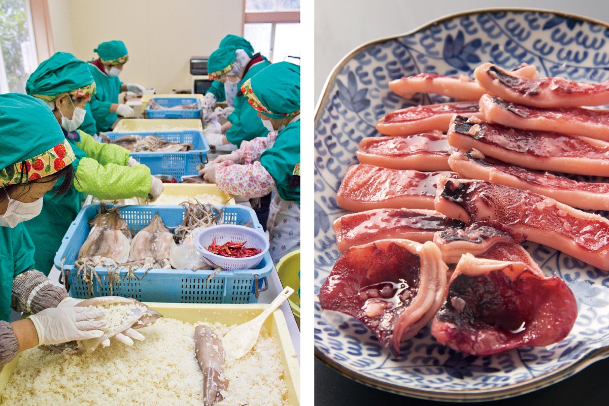 「いかの樽寿司(なれずし)」は、海岸で干したスルメイカを米と麹で40日間程度漬け込みます。食べやすいように塩気を抑えて、独特の味わいを出すために米と麹のバランスを絶妙に調整されています。10分程度弱火で炙れば口当たりの良い柔らかさと味わいでご飯やお酒が進みます。