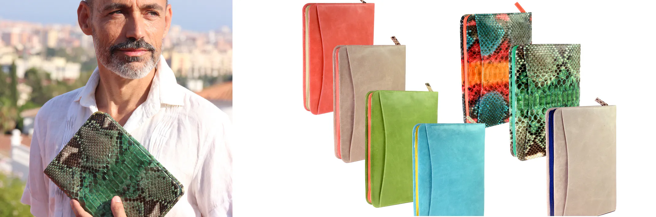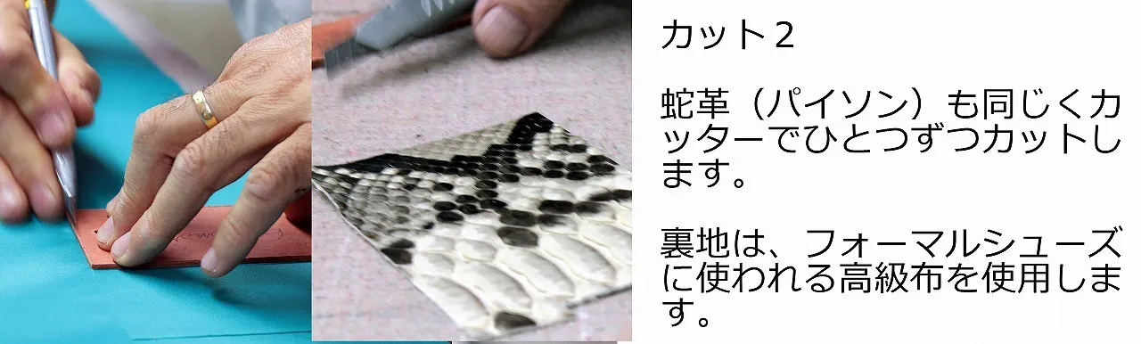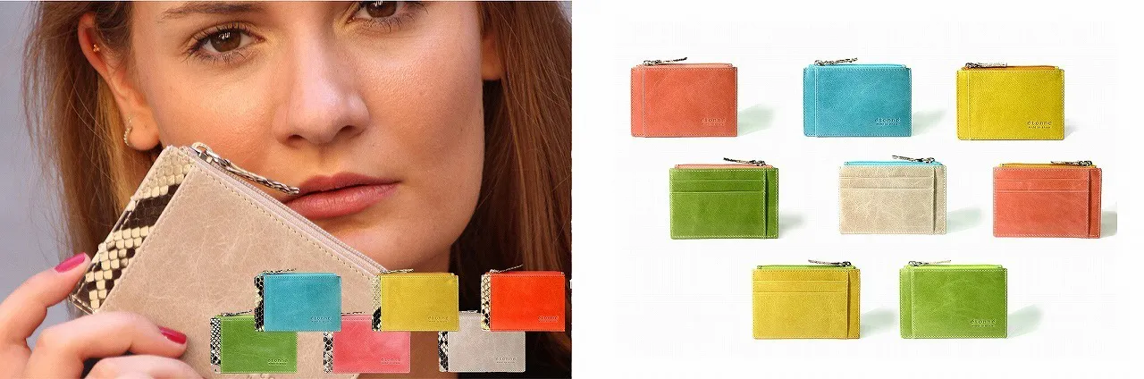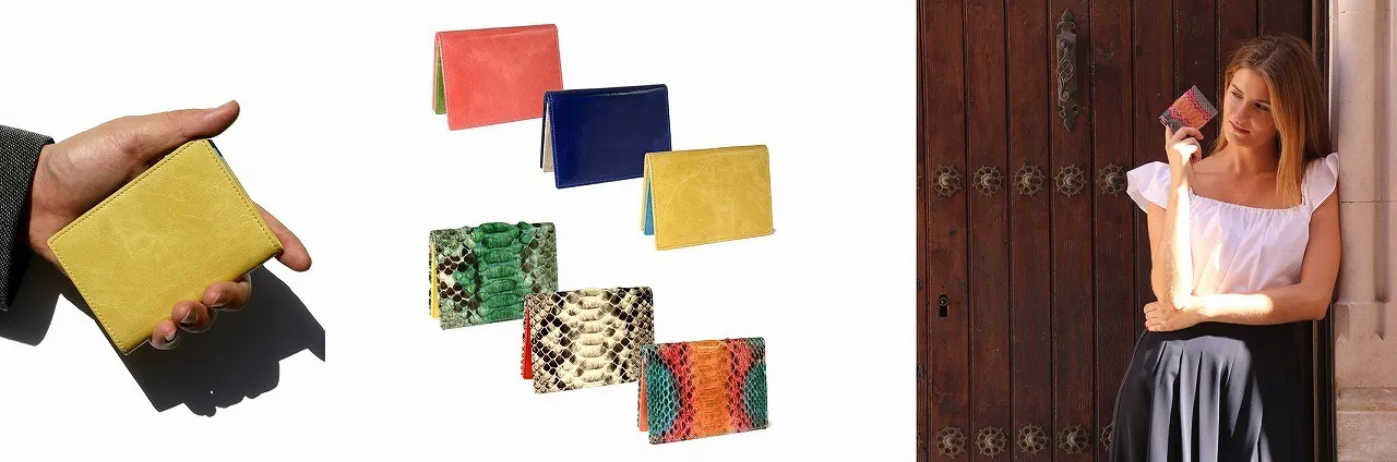 <パイソン蛇革 写真左>ブリリアントパイソンをあしらった、高級感あふれるパスケース。<ツートン牛革 写真右>前と後ろで二色のカラーが楽しめる、スペインテイスト満載のパスケースです。
