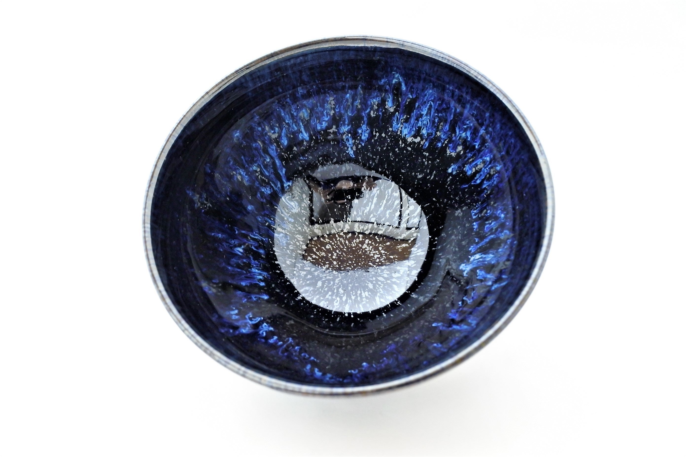 私の創る油滴天目茶碗は、宇宙、海、炎など自然の美を茶碗という小宇宙に凝縮したような絶景を楽しむことができる点が最大の特徴となります。