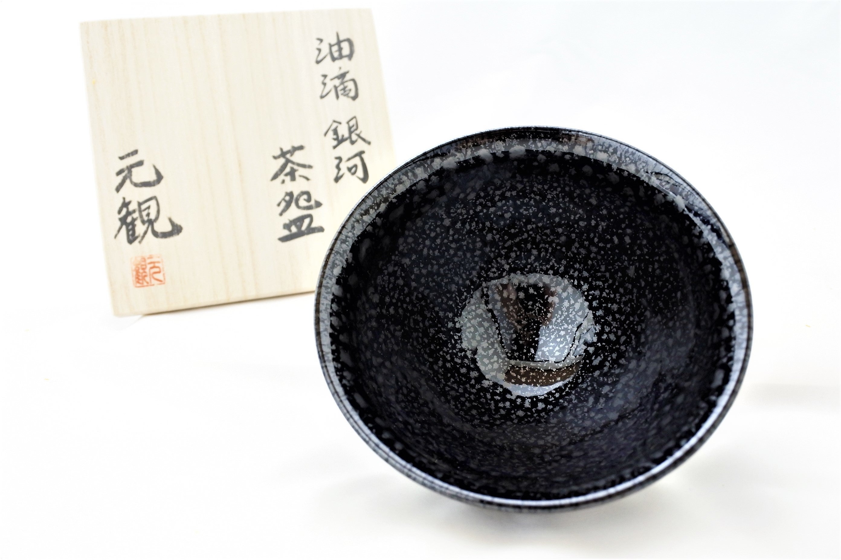 「油滴」の名は、茶碗の表面に浮かび上がった銀色に輝く斑紋(はんもん)が油の滴のような美しさであったところからそう呼ばれています。銀の斑紋の色調は、窯の中で起こる釉薬の変化によるもので、綺麗な銀色の斑紋を出すことが難しく、一つとして同じものはできない一点物の陶器となります。