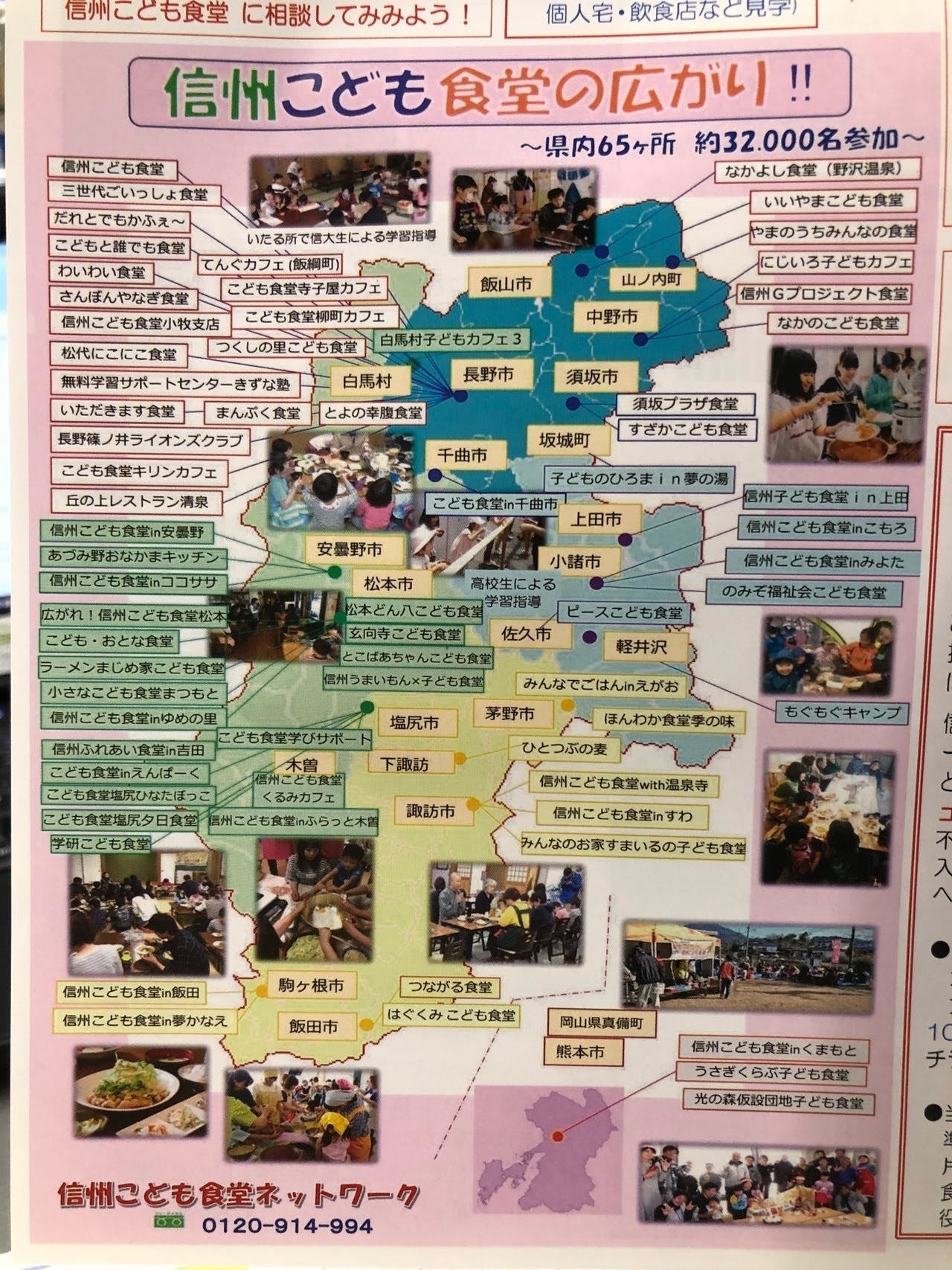 長野県の信州こども食堂は「こうでなければ」という決まりはなく、誰でも参加できる『居場所づくり』を目指しておられ、県内66ヶ所・約33000名が参加されています(平成30年12月20日現在)