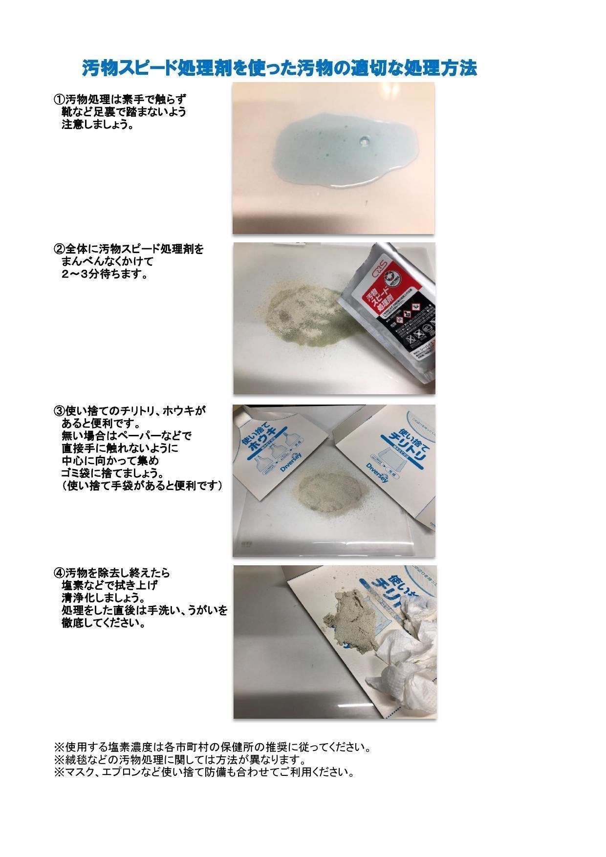 この【汚物スピード処理剤】で素早く嘔吐を処理し、殺菌用として【次亜塩素酸ナトリウム】で環境を清浄化すれば二次感染のリスクを大幅に下げることが可能となります。