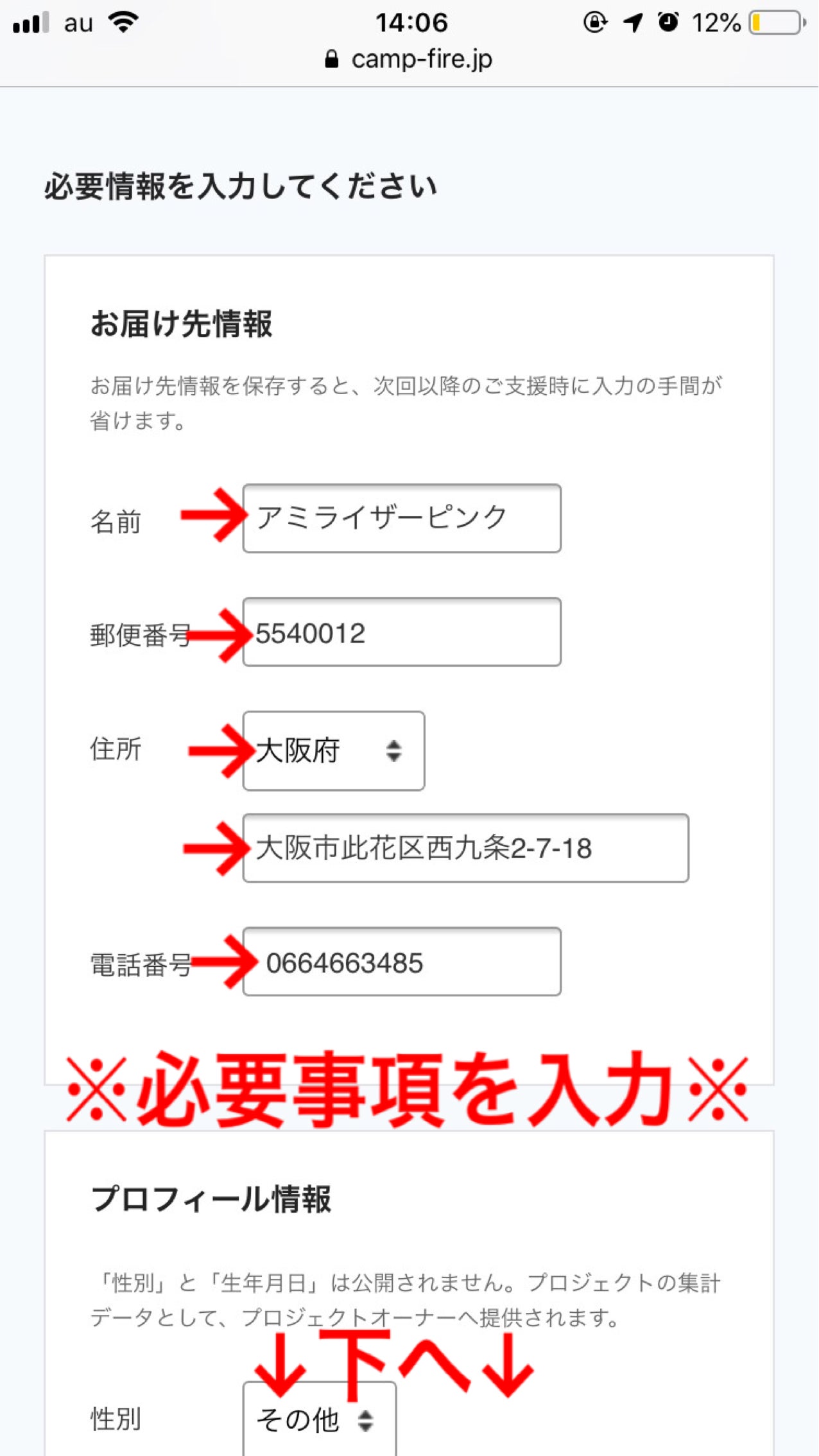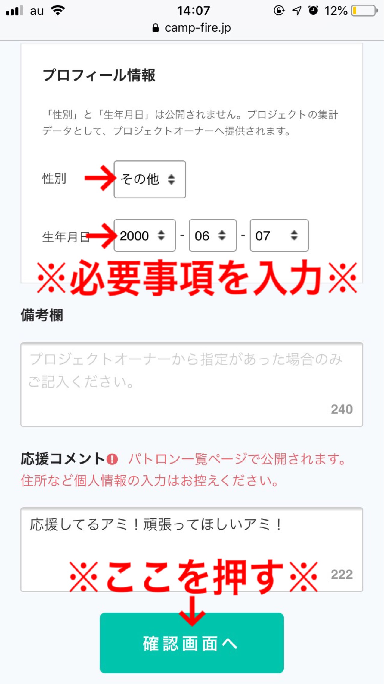 ⑧お届け先情報の入力完了後、下へスクロールしプロフィール情報を入力します。(応援コメントいただけると、とても喜びます。)すべての入力が完了しましたら【確認画面へ】を押してください。