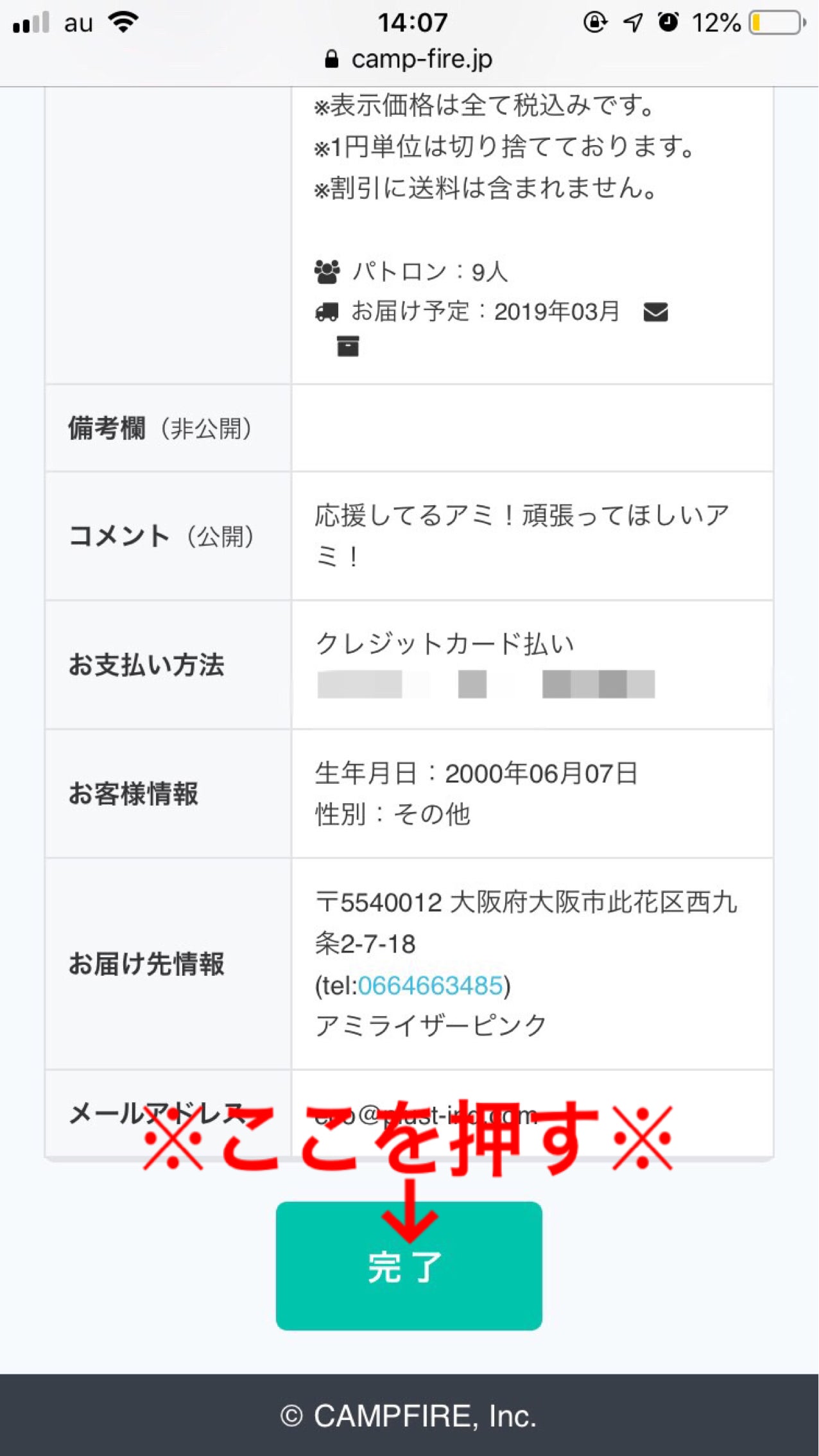 ⑩内容に間違いがなければ【完了】ボタンを押してください。