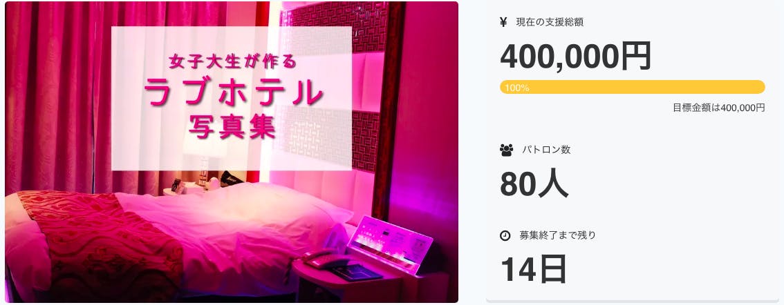 2019/03/18 19:53目標金額達成〜〜〜〜〜!3月18日 目標金額の¥400,000を達成致しました…!本当に本当にありがとうございます。支援者様80名。このプロジェクトを始めた時は予想もできなかった人数です。沢山お伝えしたいことはありますが、プロジェクトが終了する3月31日までとっておきます…!ネクストゴールは設定しませんが、終了日まで引き続きご支援頂けます!最後の最後の瞬間まで一人でも多くの方の目に止まりますように…!残り2週間というわずかな期間になりますが、残りの時間も精一杯頑張らせて頂きますので応援のほどよろしくお願いいたします〜〜!皆様、愛しています!ぺの もっと見るパトロンの皆様へ
