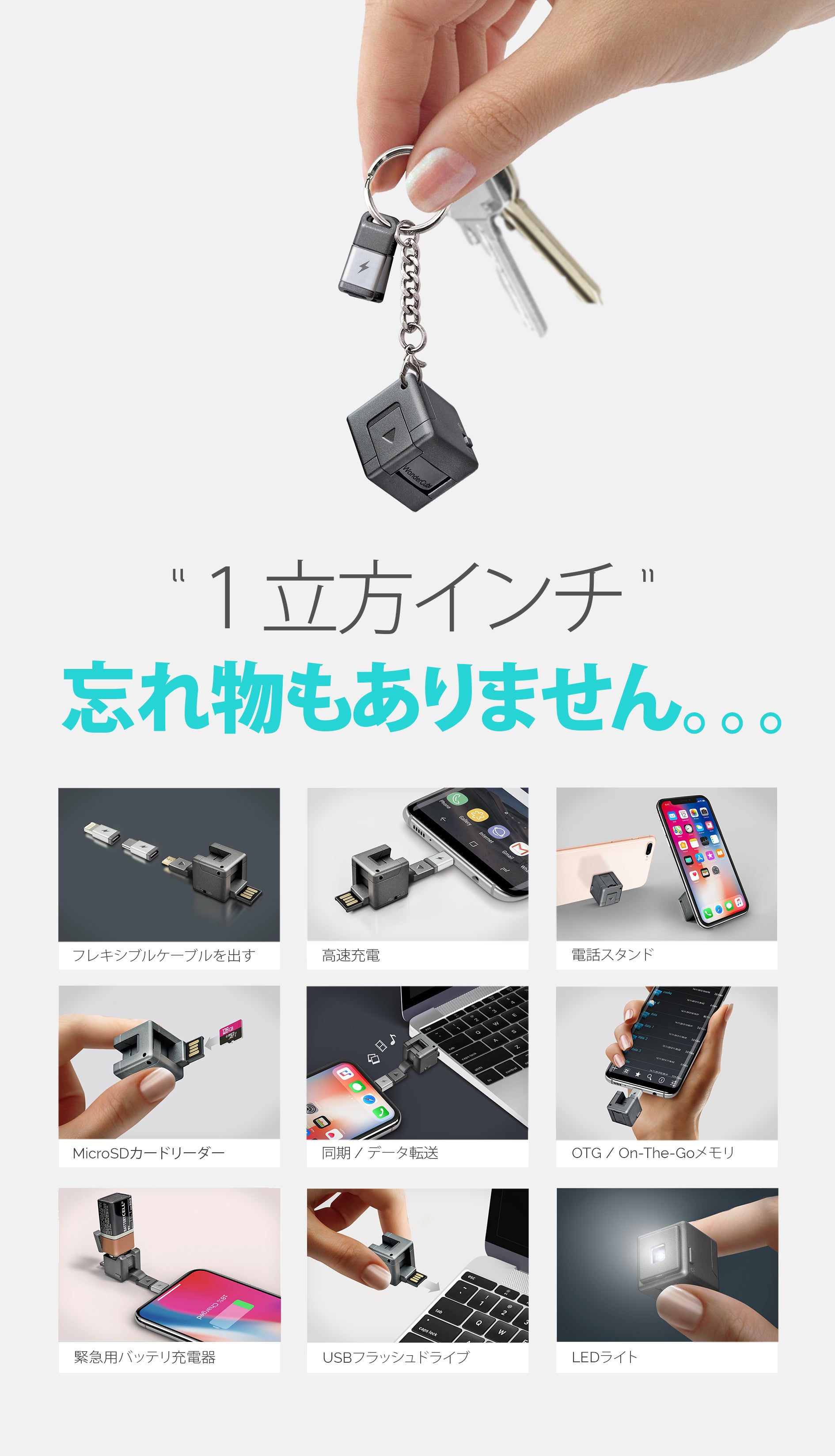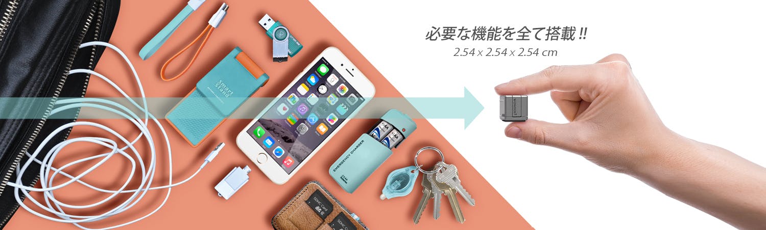 世界最小のオールインワンモバイルソリューションで、あなたの手のひらサイズで超小型です。また、いろいろな形に変形して必要に応じて利用できます。小さいキーホルダー1つで忘れ物はありません: