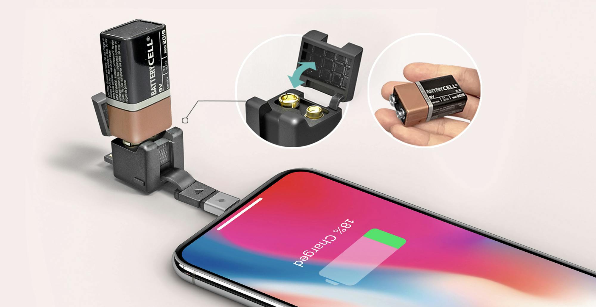 ■ 上部を開いて市販の9Vバッテリーを差し込むと、iOSとAndroidデバイスの両方で最大2〜3時間の通話時間を確保。