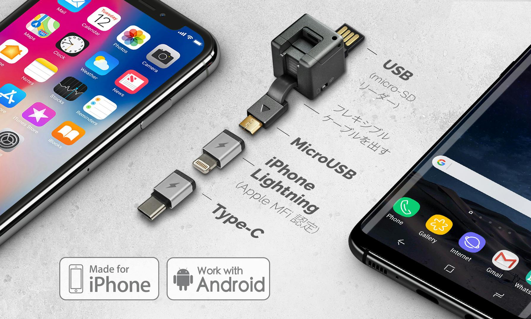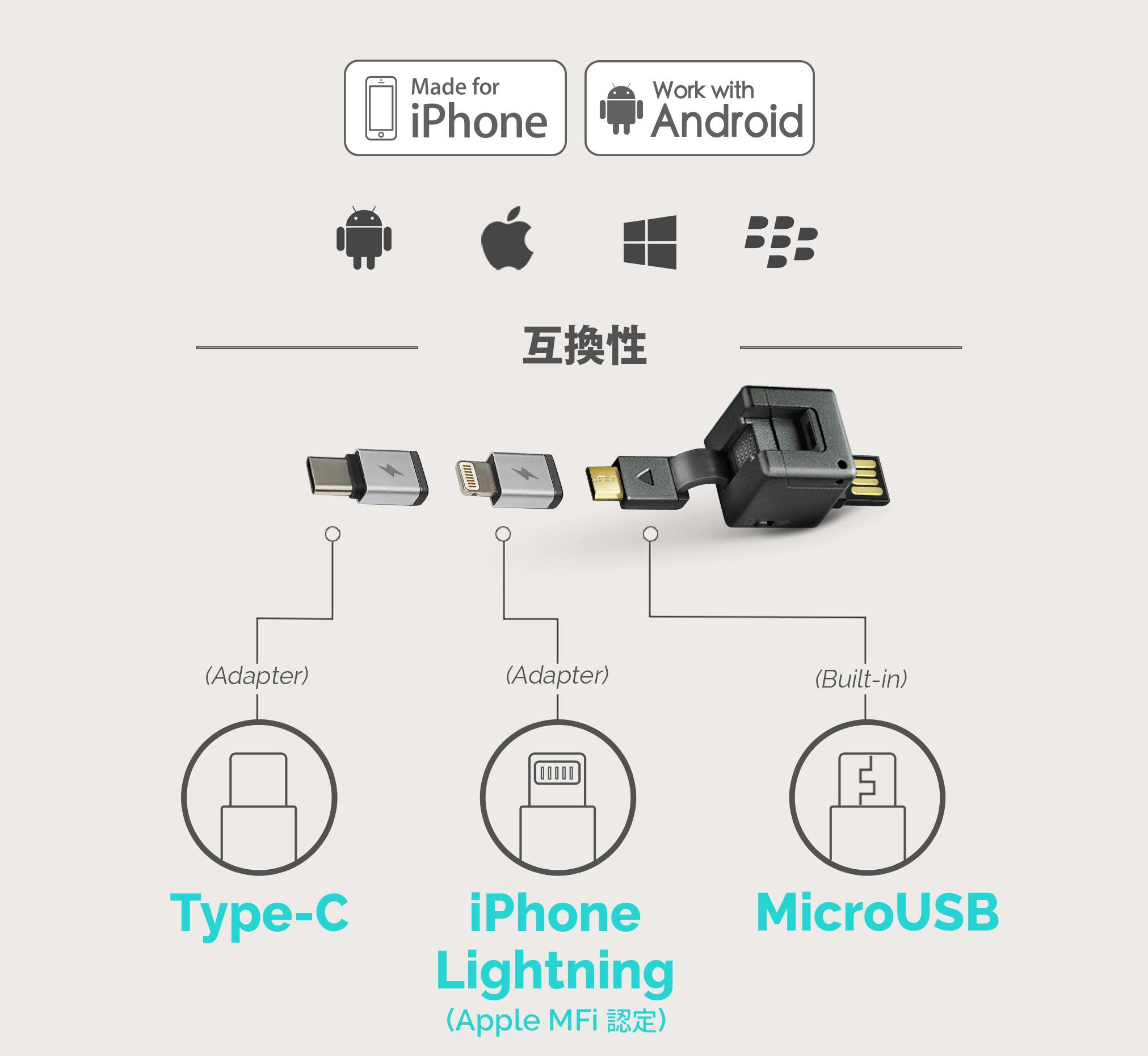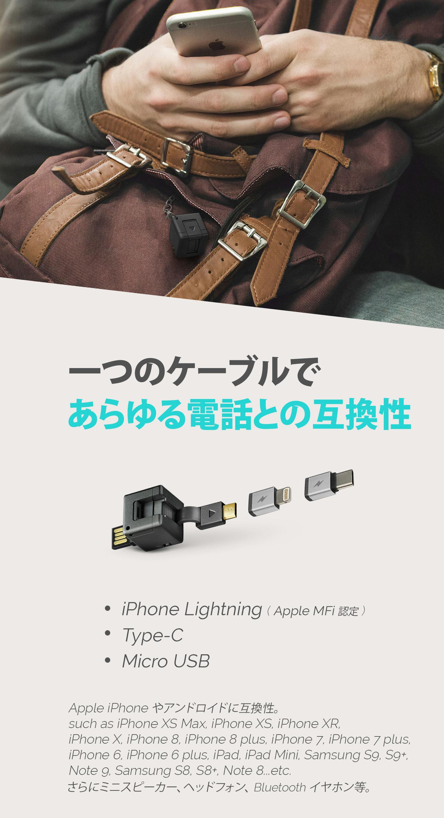 Apple 認定 iPhone MFi Lightning、Type-C、MicroUSB対応。(iPhone XS Max, iPhone X S, iPhone XR, iPhone X, iPhone8, 8+, Samsung S9, S9+, Note 9, Samsung S8, S8+, Note 8を含む)