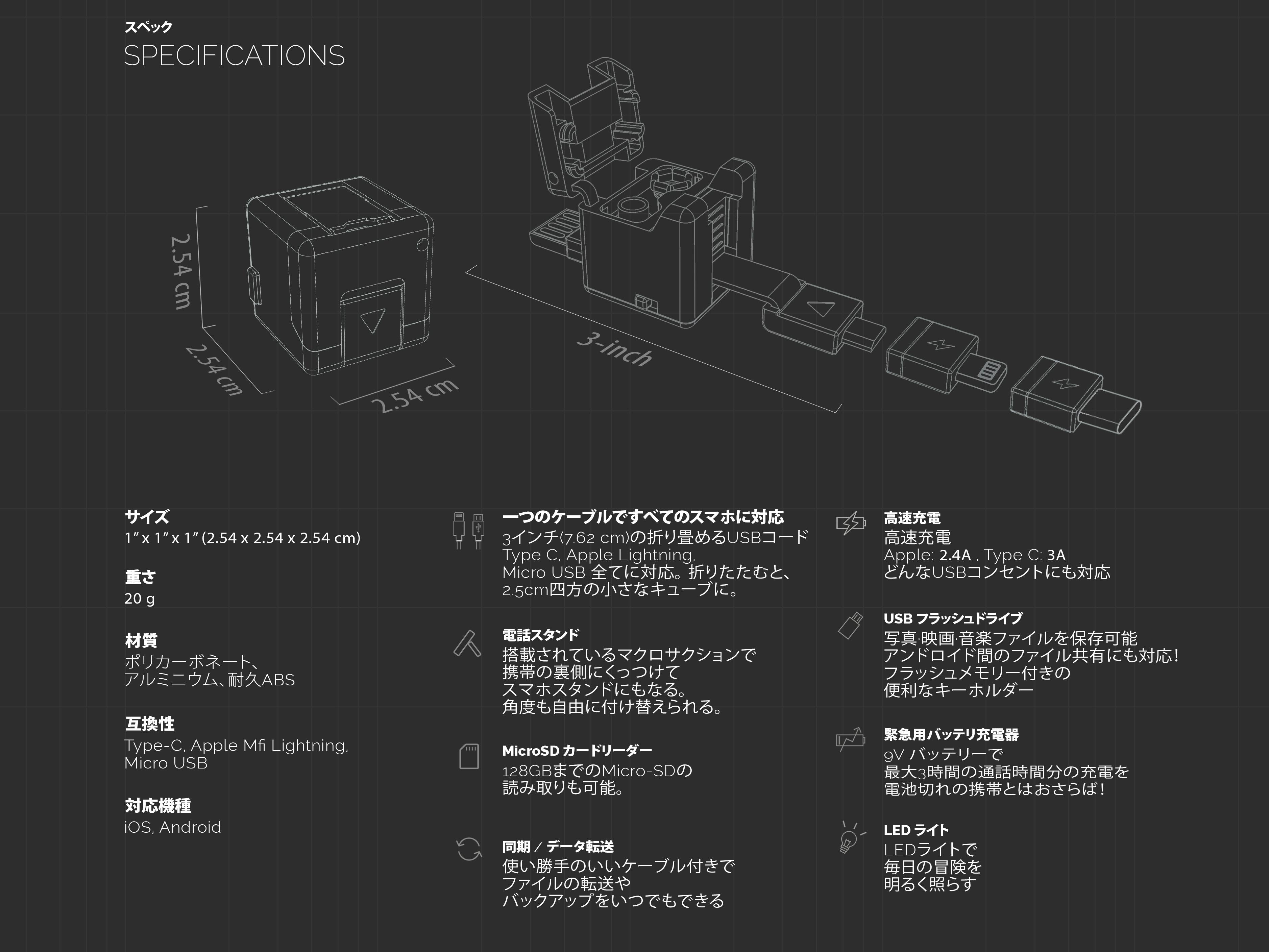 私たちは昨年、Indiegogoで7,000人を超える素晴らしい支援者から43万ドルの資金を調達しました。WonderCubeは世界中で出荷されました。そして、世界的なデザイン賞を受賞し、テレビ、雑誌、および様々なチャンネルで話題に上げられました。今年は、更に改良された最新バージョンのWonderCube Pro(全てのデバイスとの互換性(TypeC + Apple MFi Lightning + MicroUSB)、高速充電速度(最大3A)、拡張メモリ容量(前は64Gbがマックス、現在は128Gbをサポート)、強力で再利用可能、マイクロ接着バッキングも強くなった、そして強化軽量材料)の発売をします。