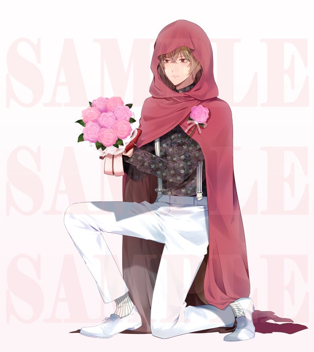 跪いて花束を差し出している赤ずきん。プロポーズの瞬間。