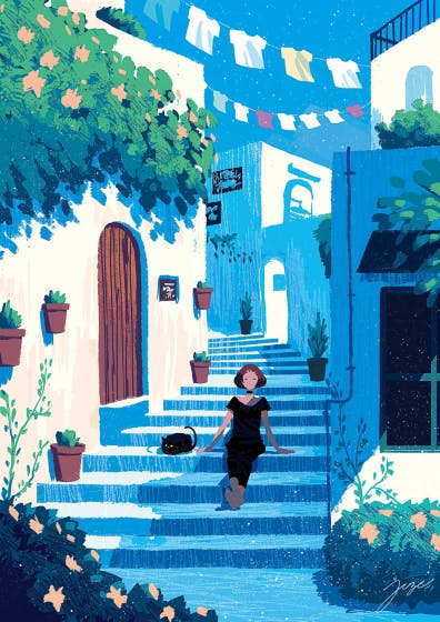 ▲映画のワンシーンのようなイラスト。行ってみたくなる風景も素敵です。
