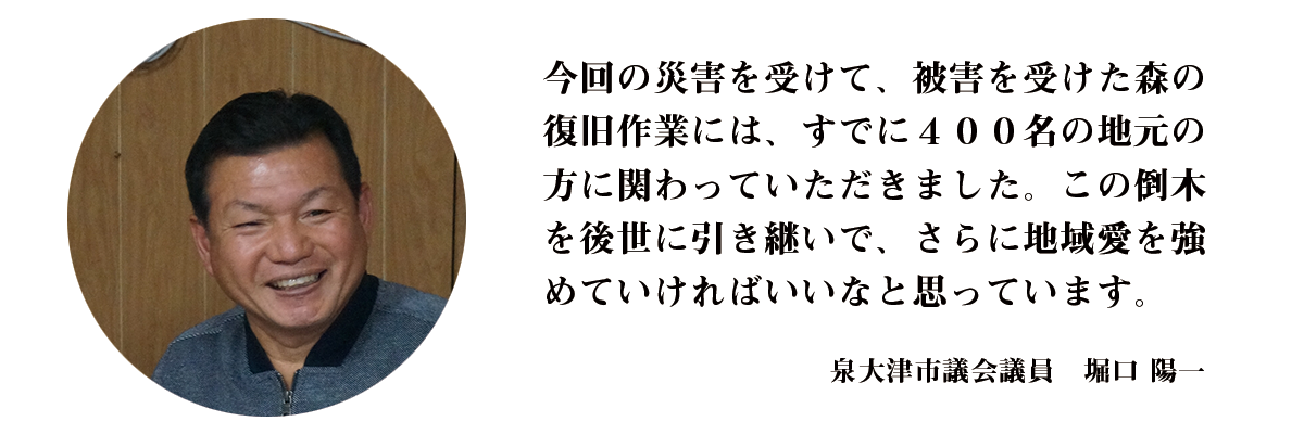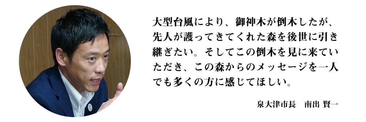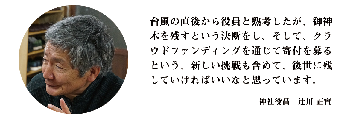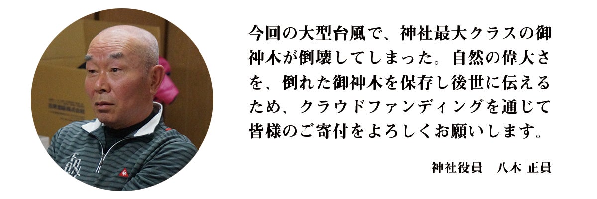 日本全国各地が毎年のように自然災害の被害を受けているが、その記憶はどうしても薄れてしまっているように思う。今後の教訓として活かすためにも、災害遺産という「形」として残し、多くの方々に見ていただいた方が、この御神木も喜んでくださるのではないだろうか?