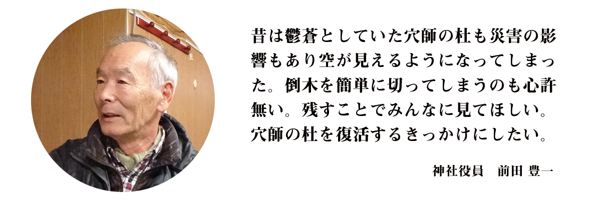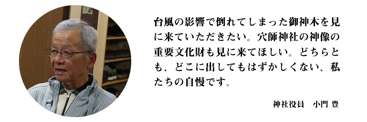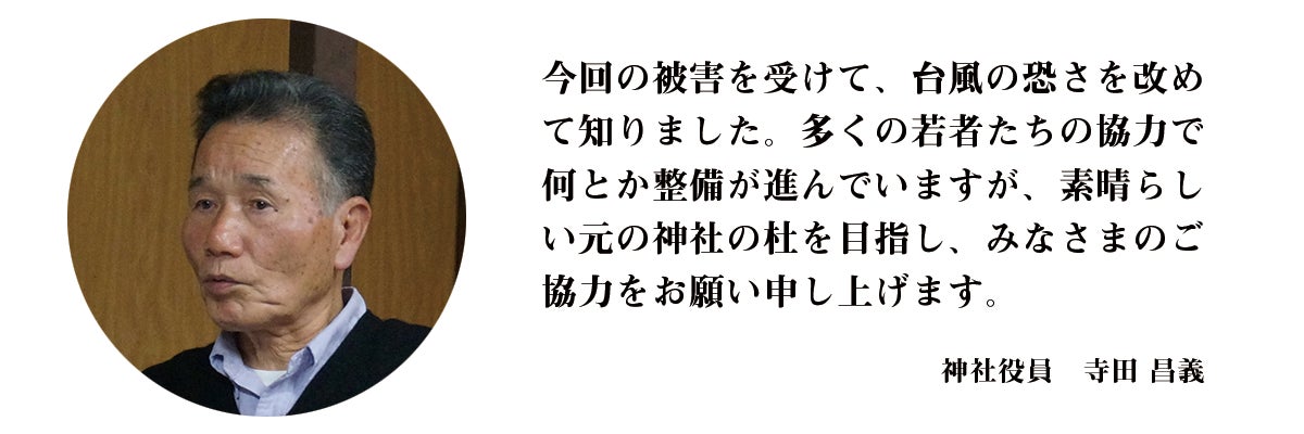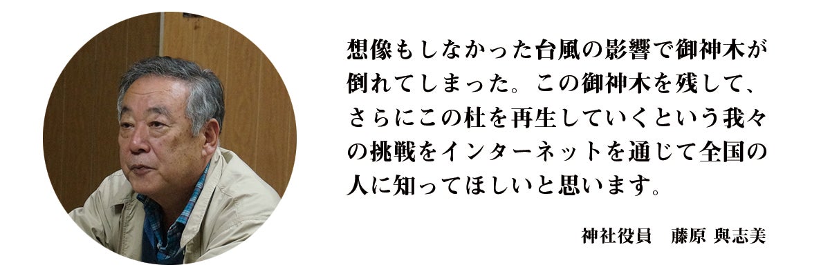 このプロジェクトを進めるにあたり、ご協力頂いたみなさまの思いをまとめさせていただきました。ぜひともこのプロジェクトにご賛同いただき、少しでもご協力いただければ幸いでございます。最後までご覧いただきまして、本当にありがとうございました。(泉穴師神社・47代宮司 津守康有)
