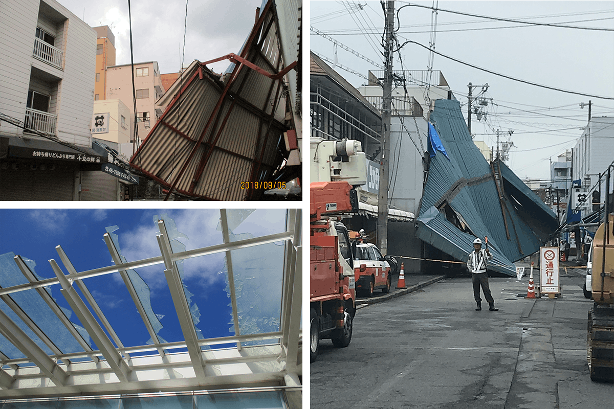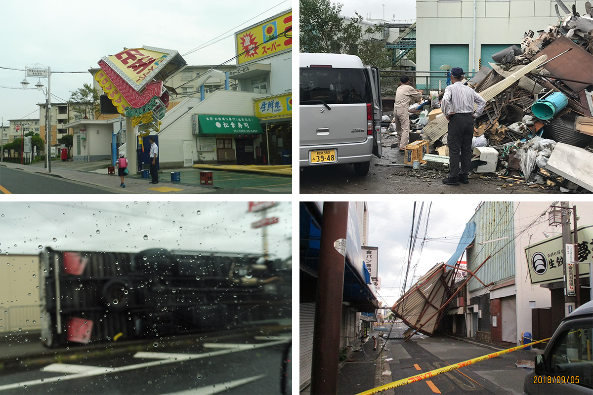 当社がある大阪府泉大津市では、13時48分に大阪府下最強の最大瞬間風速61.1m/s(13時48分、泉大津市消防本部)を観測し、市内各所に甚大な被害をもたらしました。