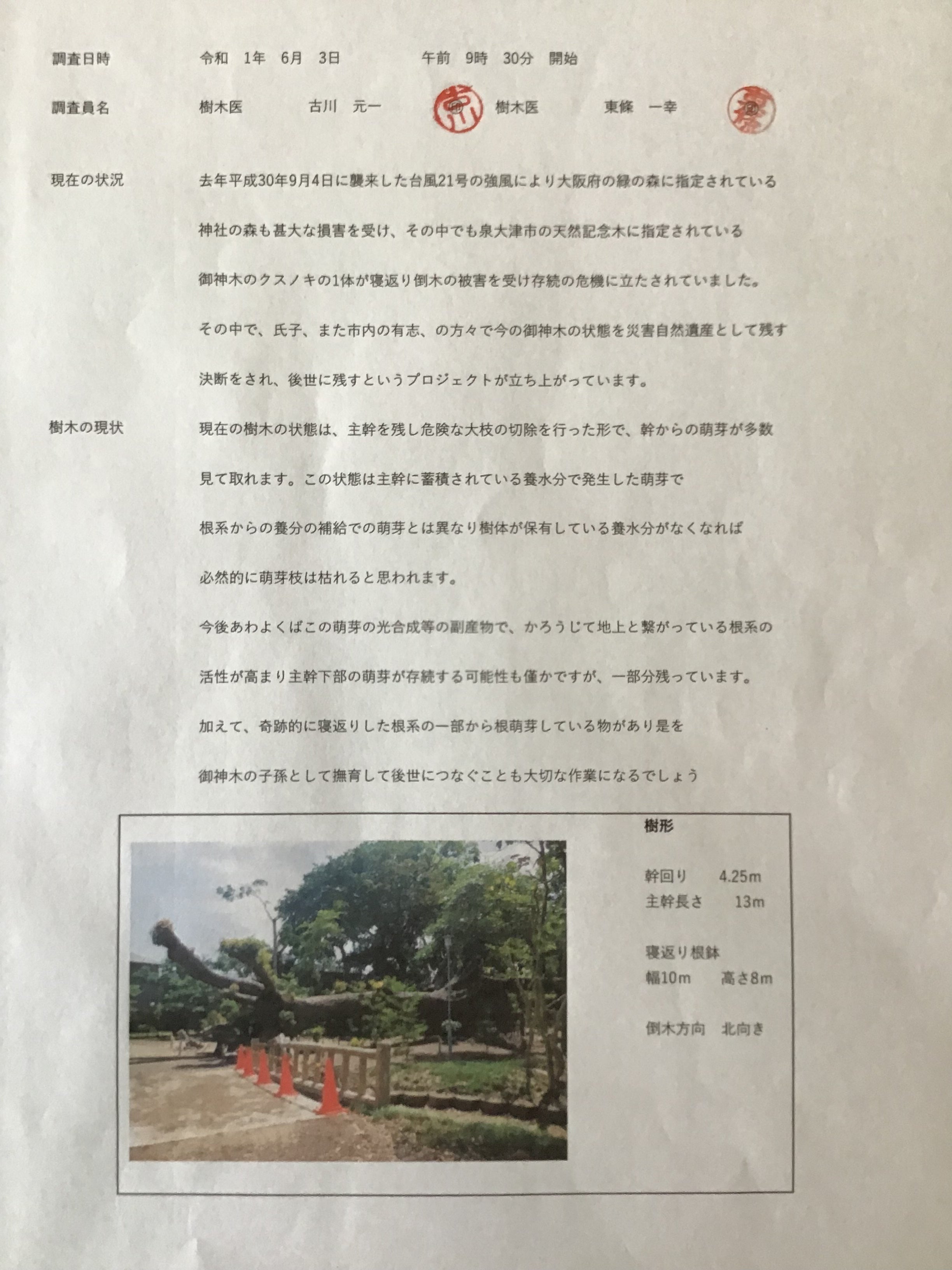 2019/06/06 10:46先日6月3日、樹木医の古川先生、東條先生に御神木を診断していただきました。写真は診断書です。現在切断した枝から萌芽が多数芽吹いていますが、これは幹に蓄積されている養分で発生した芽なので、幹の養分が無くなれば芽は枯れるそうです。ただ、根の部分から萌芽しているものもあり、これを御神木の子孫として育て、後世につなぐことが大切との事です。 もっと見る