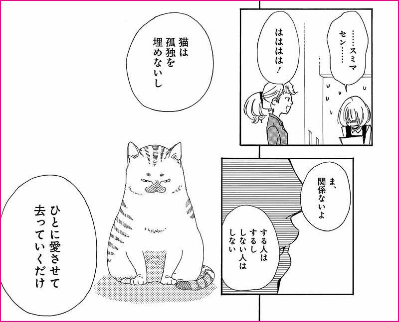 著者のウオズミさんと次回作のお話をしたのは約1年半前。二転三転と何度もネームを修正して頂き、結婚もしてない子どももいない独身のオトナ達はこんな風に思っているんではないか? と辿り着いたのがこの言葉からスタートする、猫を愛する20代〜40代の独身男女の同居物語です。
