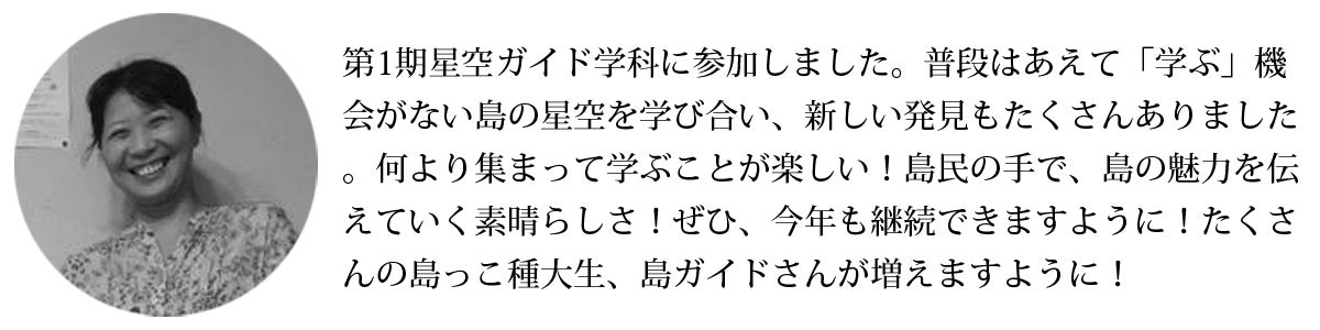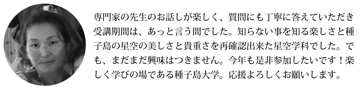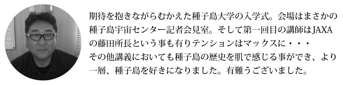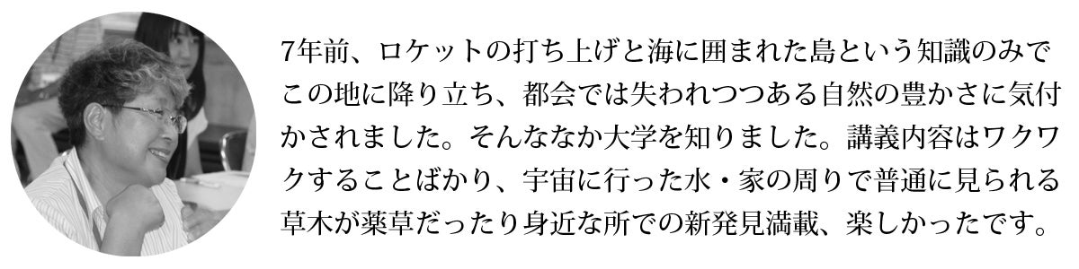 大学のための校舎や教室は必要ありません。あるときは種子島宇宙センター、あるときは焼酎工場、あるときは陸上競技場で天体観測、あるときは小雨が降る中で戦跡巡り。種子島に移住して14年目ですが、種子島大学の講座を通して、知れば知るほど種子島のポテンシャルの高さに驚き、島の魅力に感動しています。