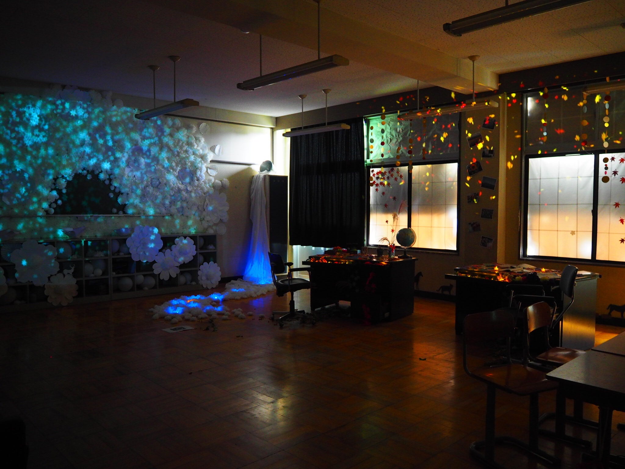 その後、統合した小学校の3年記念式でプロジェクションマッピングをさせていただくことになり地域の子供達にプロジェクションマッピングという当時はまだ珍しかった技術を届けることができました。