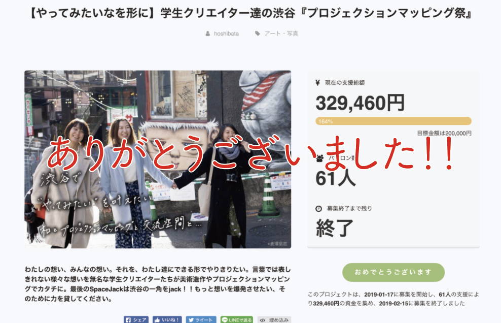 2019/02/17 14:09クラウドファンディング再挑戦、目標達成いたしました!!総額 329,460円 になりました。皆様、本当にありがとうございました。私自身、とても学びの多いクラウドファンディングでした。アドバイスをくださった方々、ご協力いただきました皆様、ご連絡をくれた皆様。一つ一つが大切なものとなりました。イベント終了後、リターン準備に取り掛かります。お待ちください。そして…イベントまで残り一週間を切りました!!2月23日・24日です!!13時よりスタートいたします・13時からダンスコンテンツまでの時間は、イラストや写真・小説などの展示を行っています! (展示ご希望の方は作品をご持参ください!ちゃんとした展示機材などはありませんが置いた り、マスキングテープで貼れるものは壁に貼れます!)・傘へのプロジェクションマッミング、フォトブースも13時よりスタート!・ダンス×プロジェクションマッピングは18時30分ごろから開始予定です!・BARは17時よりオープン!さとみママと、PORTOさんのコラボです!・ぶつぶつ交換の棚をご用意いたします!(私たちの好きが飾られています。あなたの好きを持 ち寄っていただきますと、私たちの好きと交換ができます!!)・コヤさんによる便器アートやフォトコンテンツがあります!! コヤさんにも会えますよ!誰?何??って気になる方は是非!!・竹の灯籠や折り鶴の会場装飾も必見です!!ダンサーさんは二日間で総勢5組!!1日目は女祭り、2日目は男祭りです!二日間来ても楽しめますし、ぜひ二日間ともきて欲しいです!!美術系YouTuberのいとはるさん にインタビューしていただき、YouTubeにも出演させていただきました…!! インタビュー動画ぜひこちらもチェックお願い致します!足を運んでいただいた皆様があたたかい笑顔になれるように、ご支援いただきましたものを大切に、メンバー一同頑張ります。引き続き、どうぞよろしくお願い致します。※パトロン様にお送りしておりますメッセージの内容に、お名前記載の趣旨を書かせていただいております。イベント終了後に写真集などの制作にあたりますのでそれまでにご返信をいただければ大丈夫です。よろしくお願い致します!! もっと見る