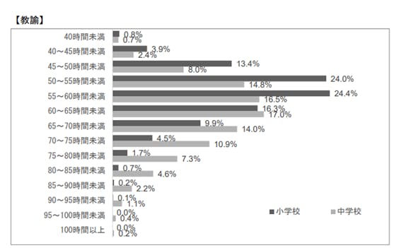 日本の教育者は、他国の教育者に比べて非常に「多忙」であると指摘され、長時間労働が問題視されている現状がある。文部科学省(2018)の調査では、中学校教員の1週間あたりの学内勤務時間数55から60時間未満が最も多かったが、グラフを見ると中学校教師の約7割以上が週55時間以上働いていることがわかる。厚生労働省によると、法定労働時間は原則として1日8時間、1週間40時間と定められている。つまり、教師の時間外労働時間は月60時間から80時間未満が最も多く、60時間以上働く教員が約7割であることが分かる。