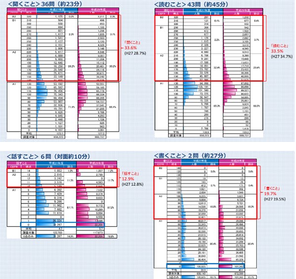 文部科学省が2017年に実施した高校生を対象とした調査によれば、A2レベル以上の割合が全体の12.9%、無得点者の割合が18.8%と、他の技能に比べると非常に低いことが報告され、さらに4技能の統合的な言語活動をより注視し、話すことや書くことの育成強化が必要であると述べられている。