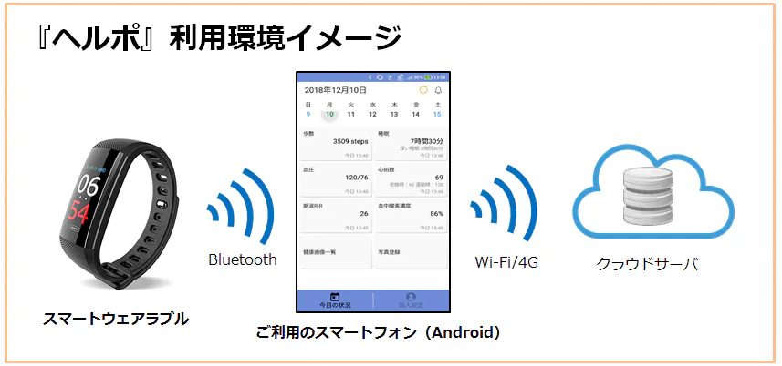 ※ご利用に際しては、スマホ(Android ver5.0以上)に『へルポ』アプリをダウンロード