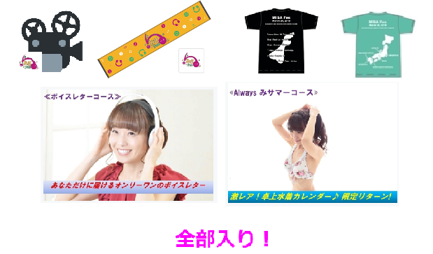 司会権+メイキング映像限定配信(エンドクレジットにお名前を掲載させて頂きます)+みさFesTシャツ+マフラータオル+ロゴ入り石鹸+ボイスレター+読み聞かせCD-R+水着卓上カレンダー+金沢弁五段活用Tシャツ+ステッカー
