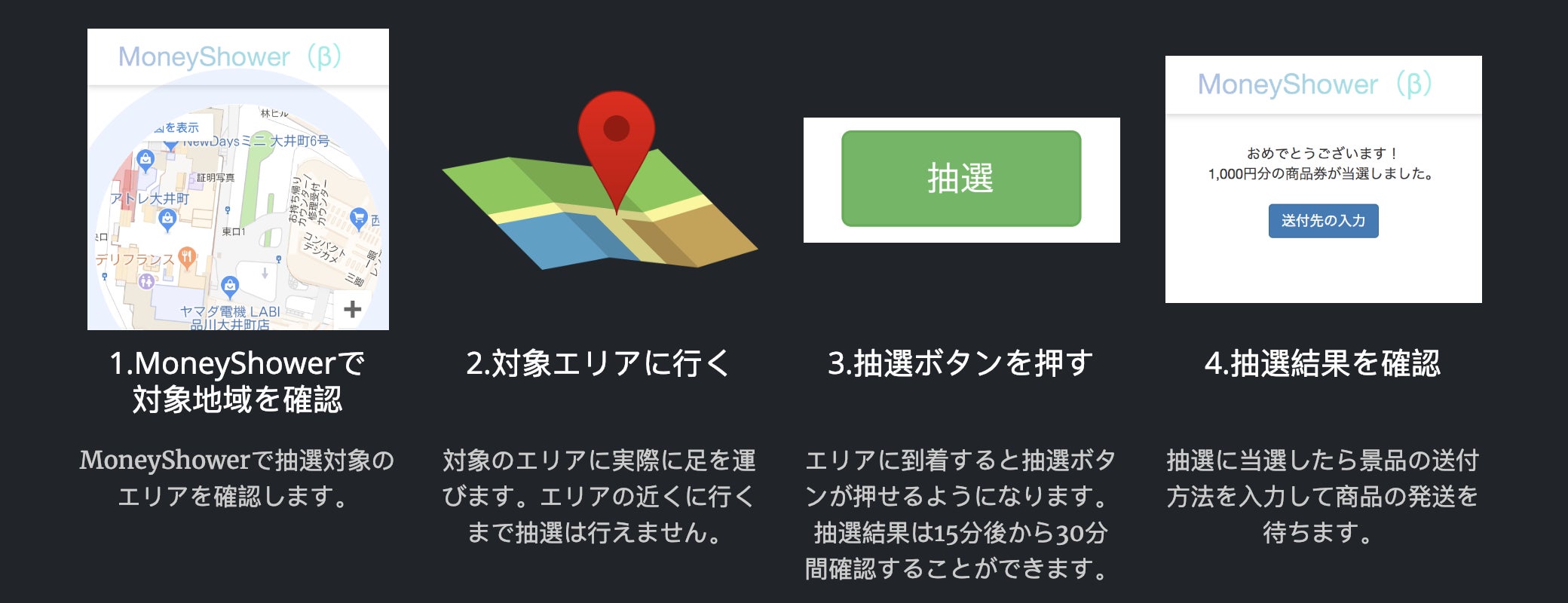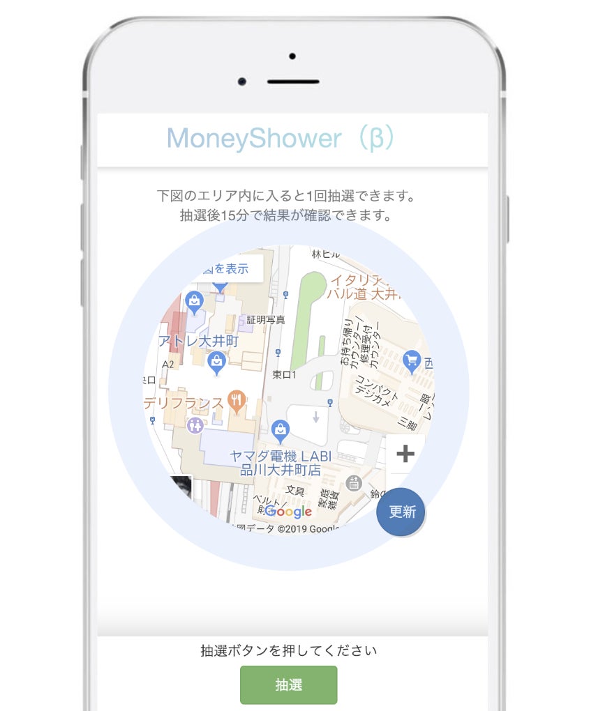 MoneyShowerは指定時間に指定場所でのみくじが引けるサービスです。