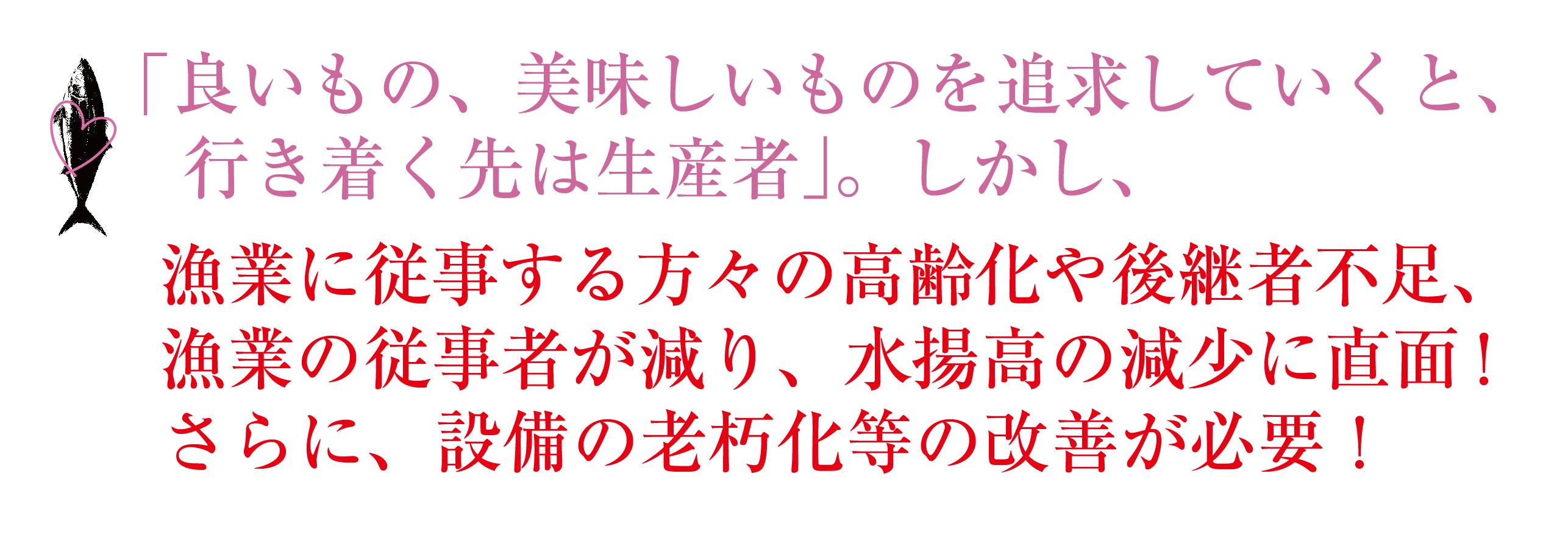 「良いもの、美味しいものを追求していくと、行き着く先は生産者」。私たちは生産者と一心同体であり、ともに生きています。つまり、生産者がいないと僕らは生きていけず、「生産者は魚を獲ってきていただいている存在」です。そして値段をたたくだけではなく「良いものをきちんと評価し、良い値段で買うことが生産者への貢献」と考えています。一方で生産者として漁業に従事する方々の高齢化や後継者不足、それにともない漁業の従事者が減り、水揚高が減少するという大きな問題に直面をしています。さらに、設備の老朽化等の改善も必要です。こういった課題はあまり生活している中であまり実感はわきません。伝わりにくい情報を届けたいをきちんと伝えたいと思っています。
