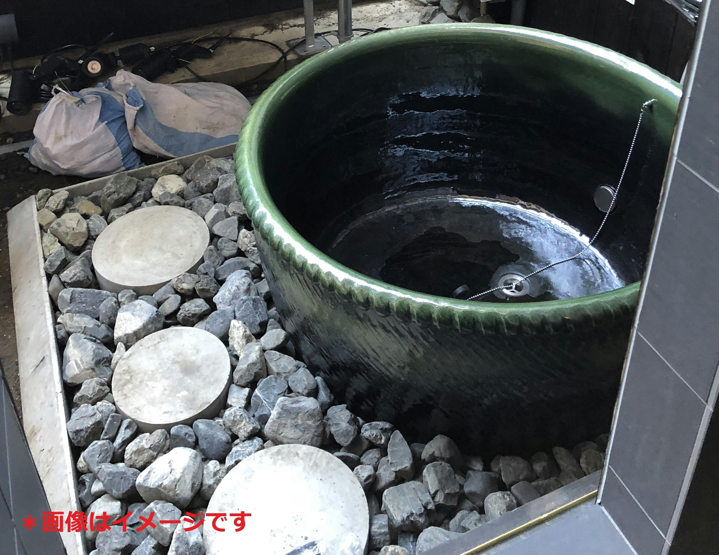 信楽焼きの湯船が茶器のように黒く、植わってる緑が舞落ちてきたように、釉薬の垂れがある湯船。