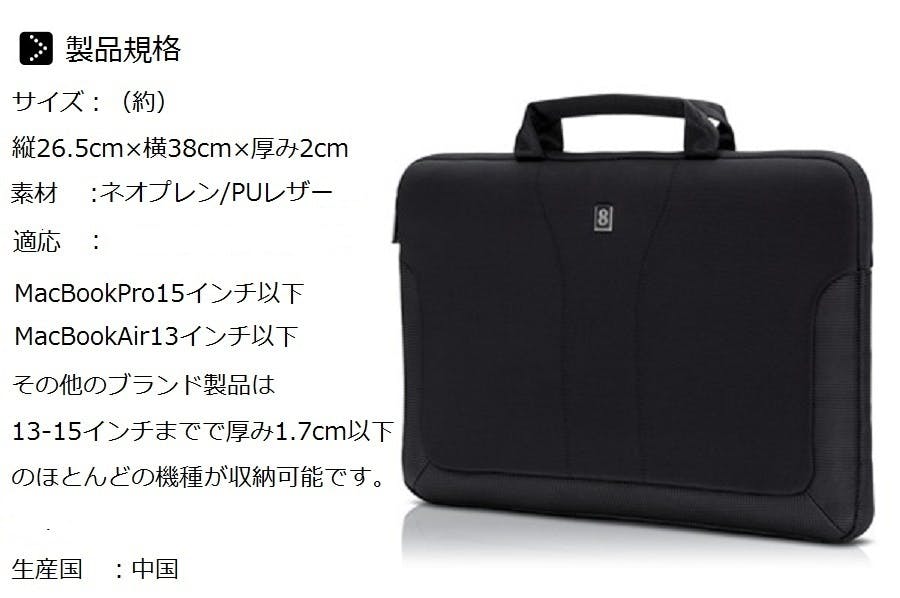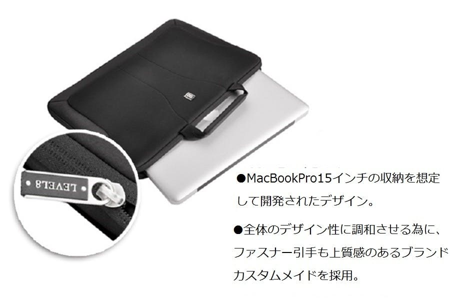 機器への衝撃を抑え吸収できる独自のパテント技術である″3D EVA 緩衝システム″を採用したポケットでMacBook用にデザインされ、MacBook Proの13-15インチまでの製品及びMacBook Air 13インチに適合しており、その他のブランド製品の13-15インチまでの大きさで厚み1.7cm以内のラップトップコンピューターとはほとんどの機種と互換性があります。