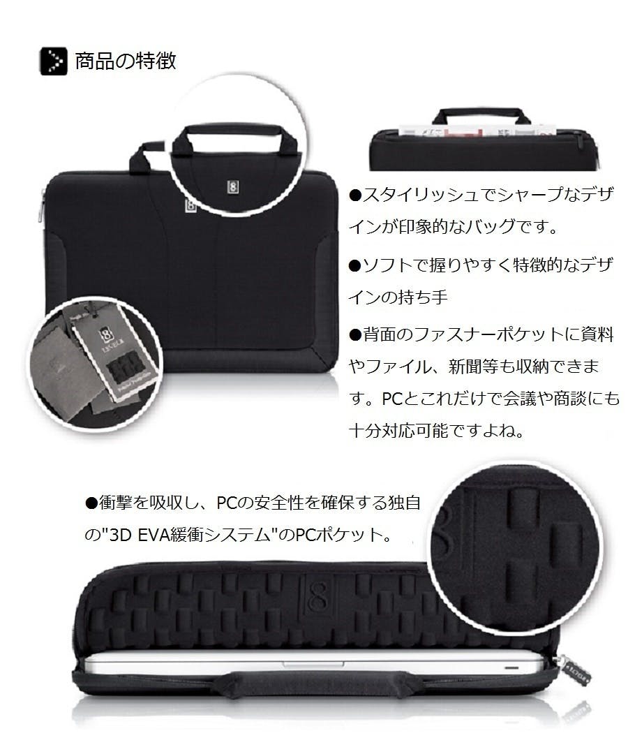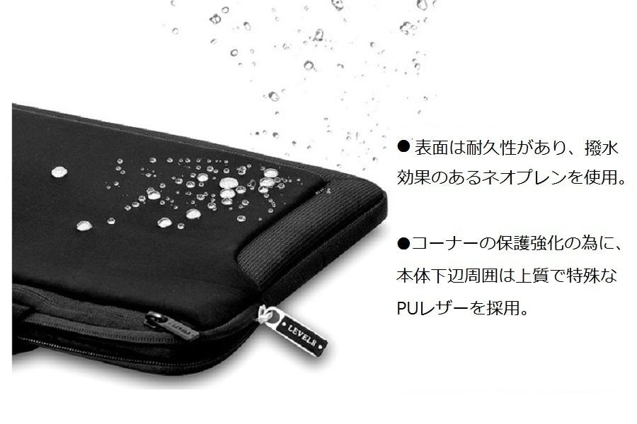 スタイリッシュなデザイン性のあるスリーブバッグで、本体表面は高い耐久性と保護力、撥水力のあるネオプレンと上質なPUレザーを使用、PC用ポケット内部は機器への衝撃を抑え吸収できる独自パテント技術の″3D EVA緩衝システム″を採用。