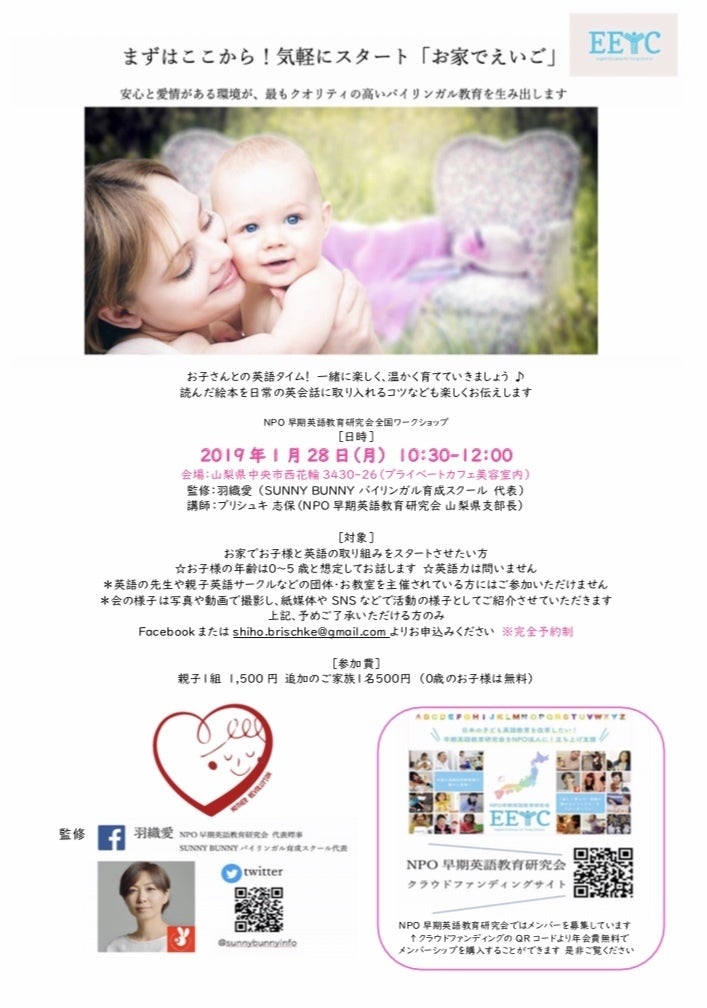 研究会ではこの全国一斉ワークショップを通じて楽しく愛情を持ってバイリンガル教育する方法をお伝えし、効果の出る英語教育の普及に努めます。