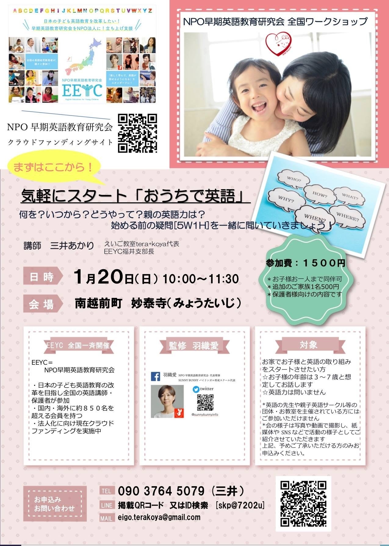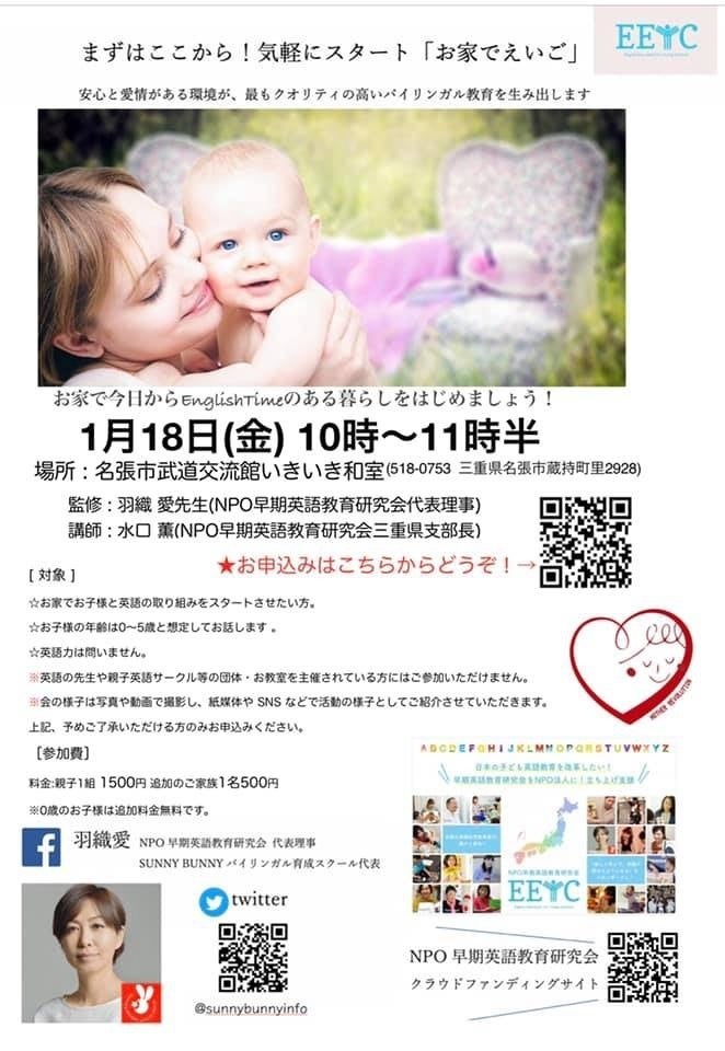 NPO早期英語教育研究会 全国一斉ワークショップまずはここから!気軽にスタート「お家でえいご」三重支部でも開催決定!!ご参加・情報の拡散をおねがいいたします。1月18日金曜日 10時~11時半名張市武道交流館いきいきの和室で、NPO早期英語教育全国一斉ワークショップを三重県でも開催します! 下記、主催の水口薫 三重支部長より監修は同NPO代表理事の羽織 愛先生です!三度の飯より英語教育が大好きで、インターも留学もしていないのに、お教室への通学でバイリンガルキッズを輩出しているSunny Bunnyメソッドの考案者です!私自身、ワークショップは初めての試みです ワクワクしています[ 対象 ] ☆お家でお子様と英語の取り組みをスタートさせたい方。☆お子様の年齢は0~5歳と想定してお話します。☆英語力は問いません。※英語の先生や親子英語サークル等の団体・お教室を主催されている方にはご参加いただけません。※会の様子は写真や動画で撮影し、紙媒体や SNS などで活動の様子としてご紹介させていただきます。上記、予めご了承いただける方のみお申込みください。[参加費]料金:親子1組 1500円 追加のご家族1名500円(ただし0歳のお子様は無料)お申込みはこちらのフォームからお願いいたします!https://www.secure-cloud.jp/sf/1546484494zwLHQGaR