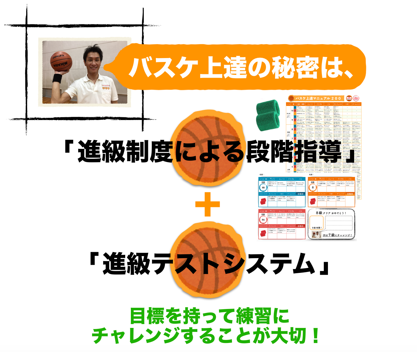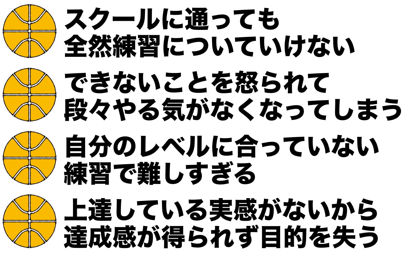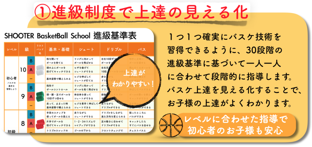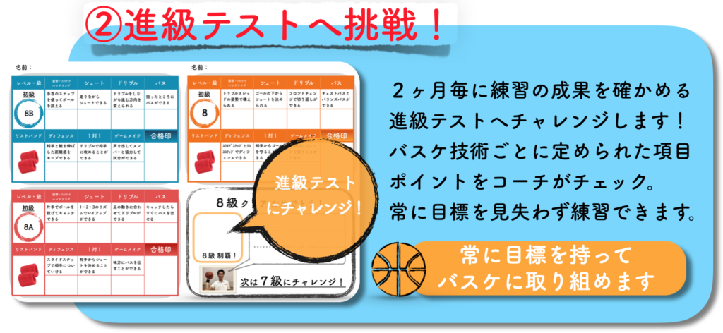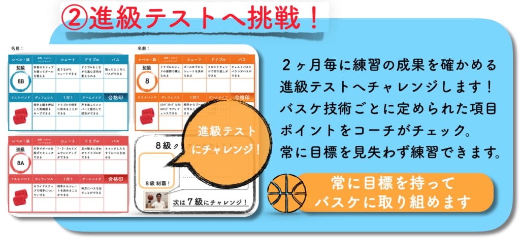 私が運営しているバスケスクールでも実施している『進級基準表に基づく無理のない段階指導』と『常に目標を持って練習にチャレンジできる進級テスト機能』『コーチにいつでも相談できるサポート機能』も付与する仕組みを考えています。