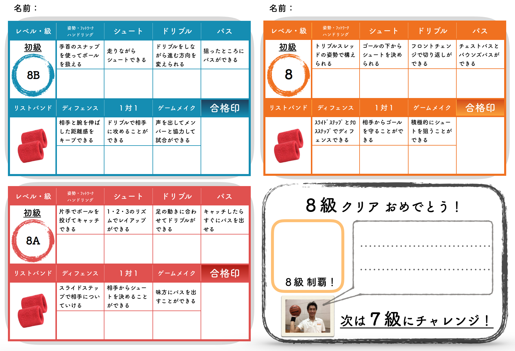 「リストバンド、合格証、テスト結果カード」をプレゼント。
