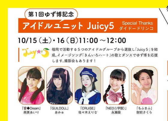 福岡市中央区天神にある商業施設「天神イムズ」で2016年10月15日(土)・16日(日)の二日間「第1回ゆず博」を開催します。ゆず商品と主に九州の美味しいもの物産展がメインのイベントなのですが、これを記念して福岡県内で活動するアイドルグループによるコラボユニットを結成しました。