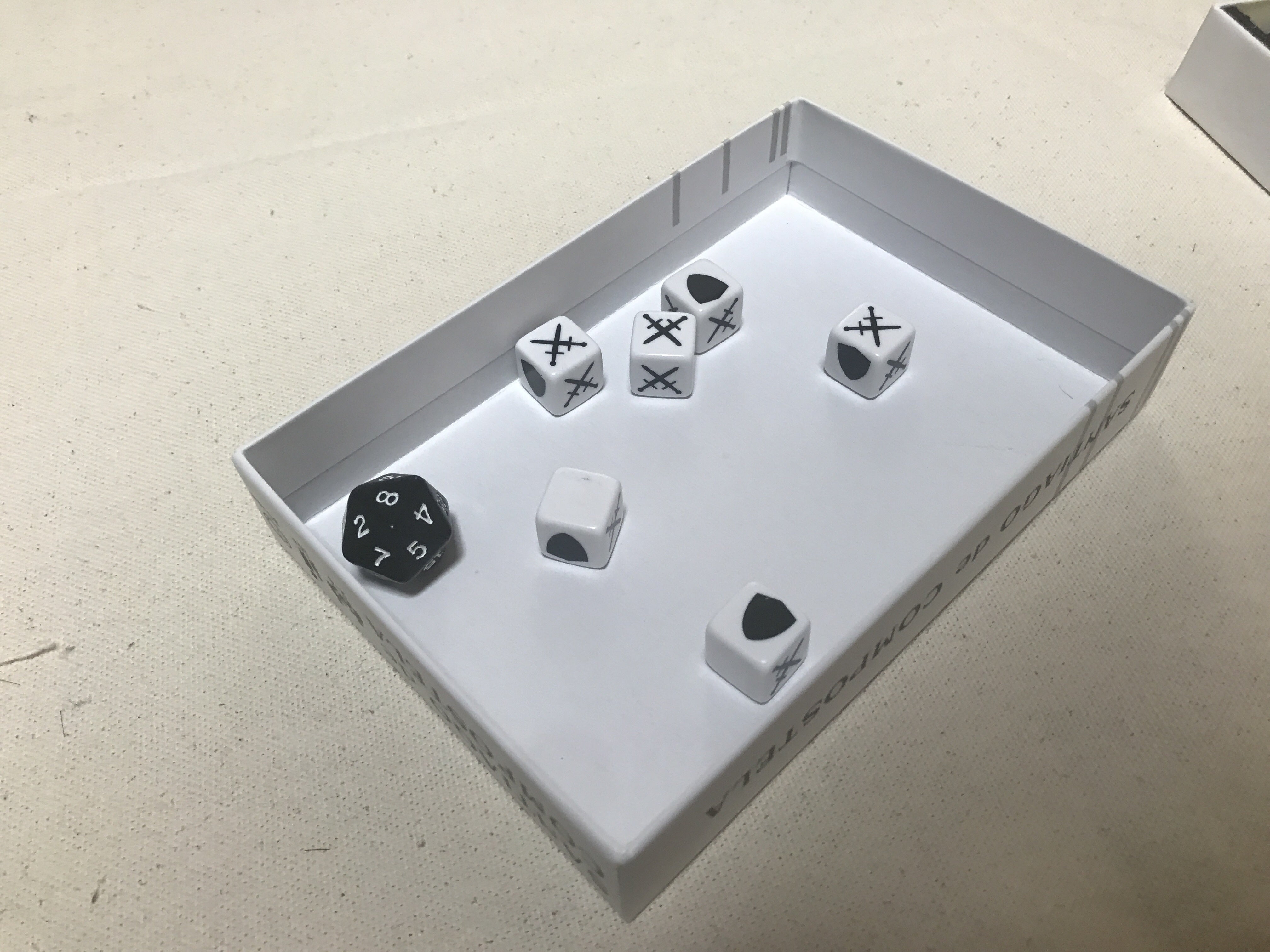 また、箱の蓋部分は、表面は汎用得点ボードになっていますが、裏返せば、ちょうどいいサイズのダイストレイや、カード捨て場としても利用可能です。