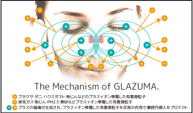 今や国民の4人に1人とも言われる花粉症を、磁石・磁気が持つパワーを十二分に活用し、何とか解決したい。そんな想いを実現するための商品が花粉対策メガネ『グラズマ(GLAZUMA)』です。
