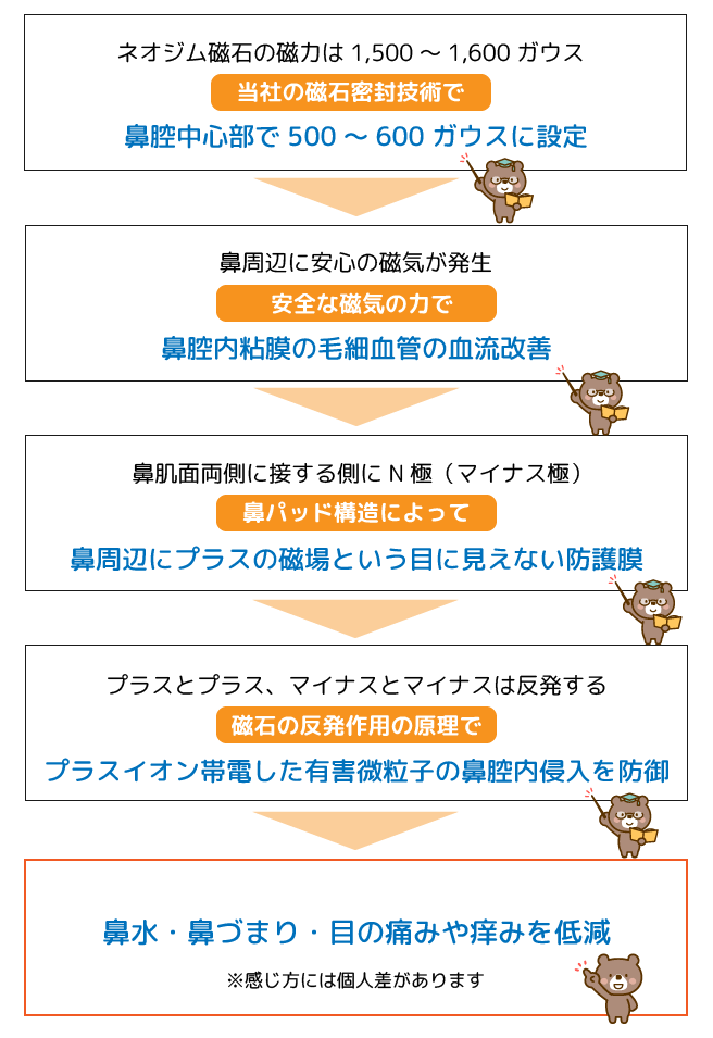 【形状】磁石の形状はまず長細い洋梨型で、鼻肌面に接する側は凸型の形状になっています。この凸型側がN極(プラスの磁極)に設定。これにより顔面にプラスの磁場(目に見えない膜)を形成します。