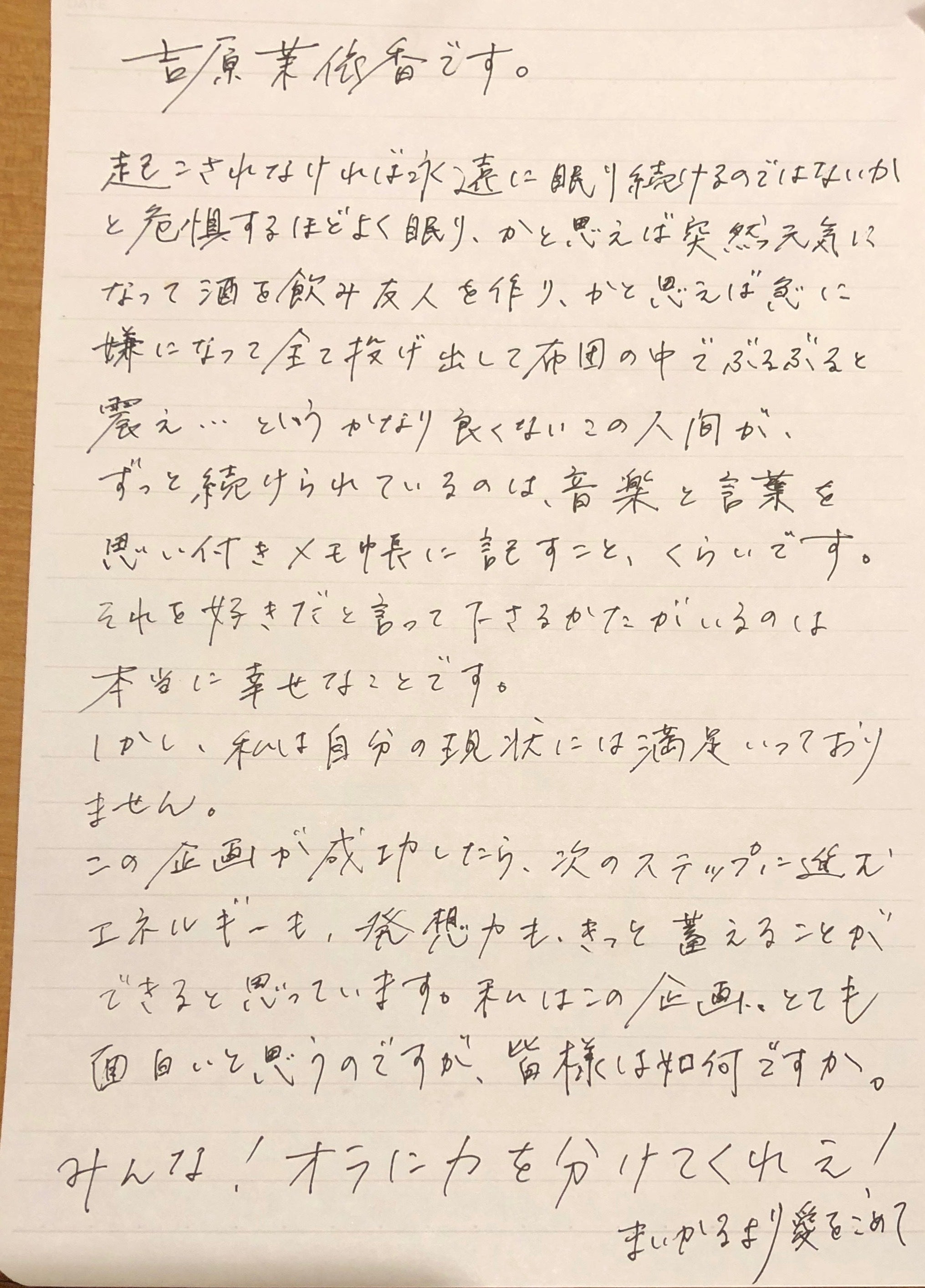 *企画ライブは、ZINEの発行に合わせてやりたいです。自分の好きなアーティストばかりを呼んで。最高じゃない?と私は思っておりますが皆様どうでしょう?いいよね?うん、わかった。いいよね。