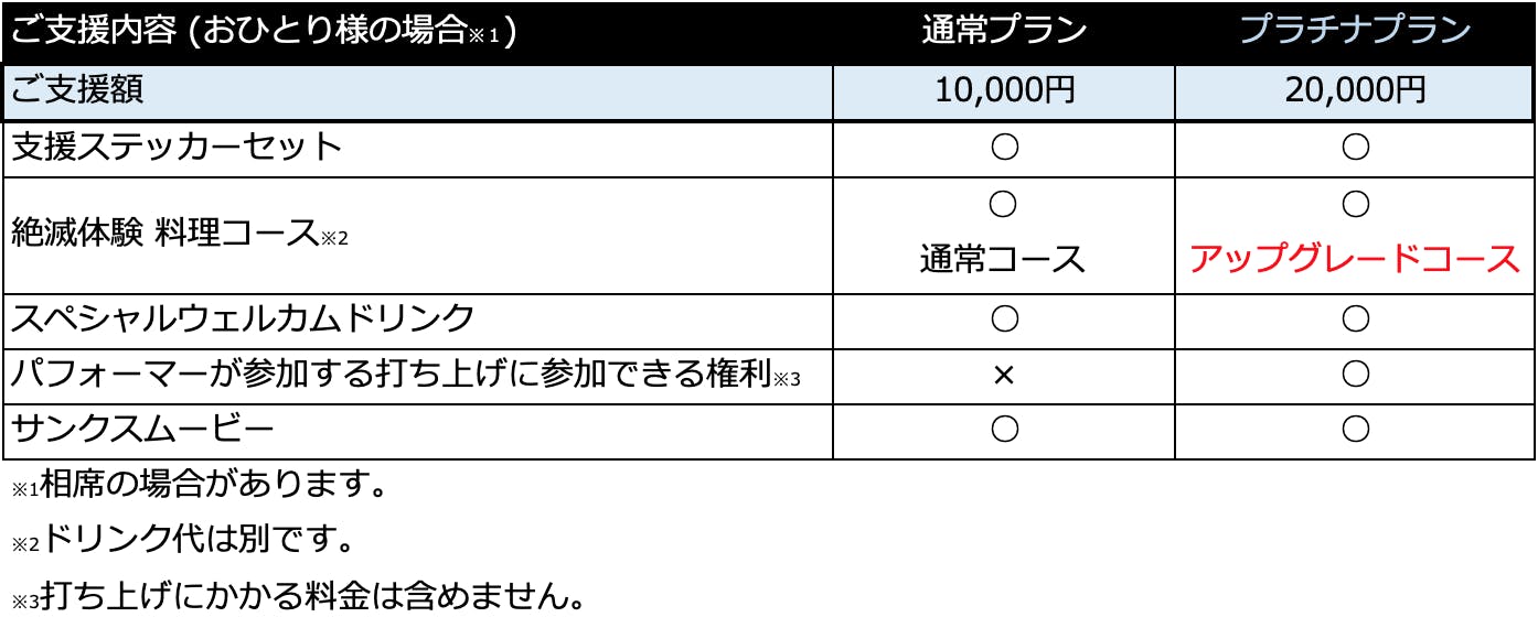 「絶滅体験レストラン」のチケットと、当日お越しいただけない方でも想いに賛同してくださる方にご支援いただけるリターンをご用意しました。