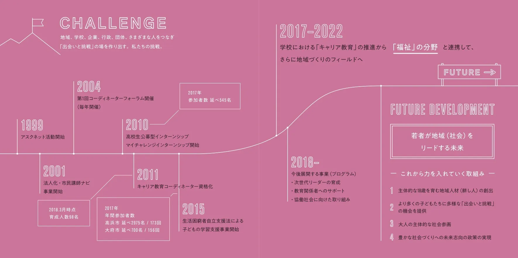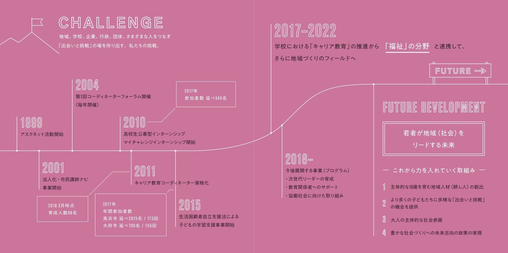 アスクネットは1999年に活動を開始し、社会人講座、インターンシップ、学習支援など、様々な活動に取り組んで参りました。昨年度から、新たに「主体的な18歳を社会に送り出す仕組みづくりとその活動をする」という5ヶ年の中期ビジョンを掲げ、これまでの学校領域の発展と共に、教育に関わる地域人材「耕し人」の創出、大人の主体的な社会参画、未来志向の政策の実現に取り組んでいきます。