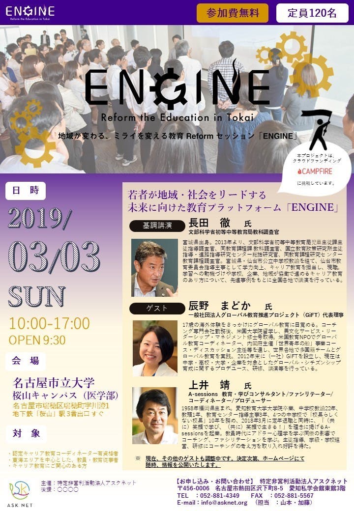 多くの多様な人々が教育に関心を持ち“耕し人”となり、大人も子どもも先生も社会総がかりで教育をつくり、持続可能な開発目標に向けて動き出す、このプロジェクトが「ENGINE」です。2030年「若者が地域(社会)をリードする未来」を見据え、そのための教育プラットフォームを東海エリアから築き上げていく第1歩です。