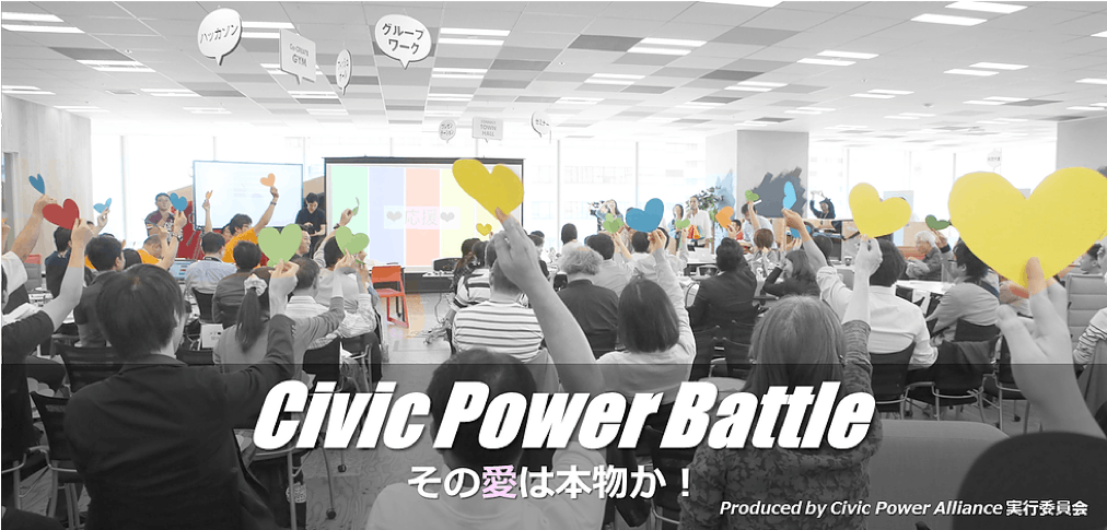 「シビックパワーバトル」<https://www.civicpowerbattle.org/>は、2017年9月23日にヤフー本社のLODGEで、第1回シビックパワーバトルが開催され、流山市、さいたま市、横浜市、千葉市、川崎市(参戦順)が「遊ぶ」「働く」「住む」というテーマで、バトルが繰り広げられました。その後に全国各地で開催されています。